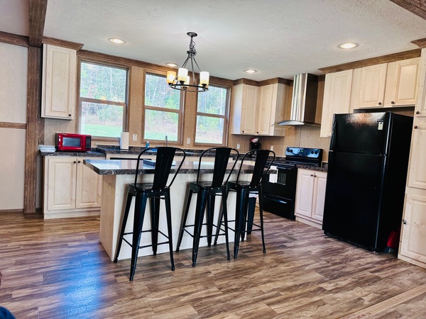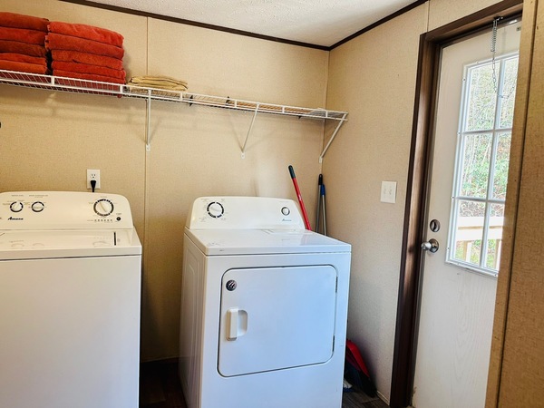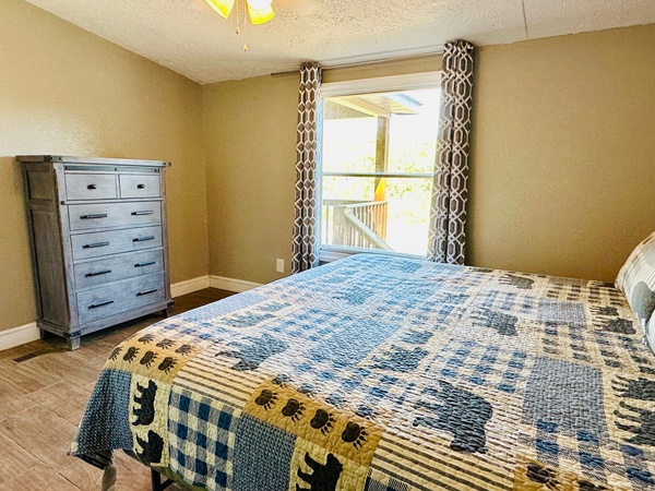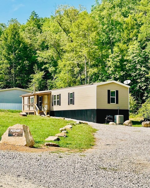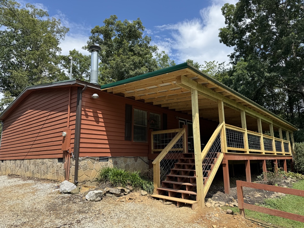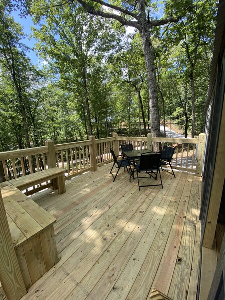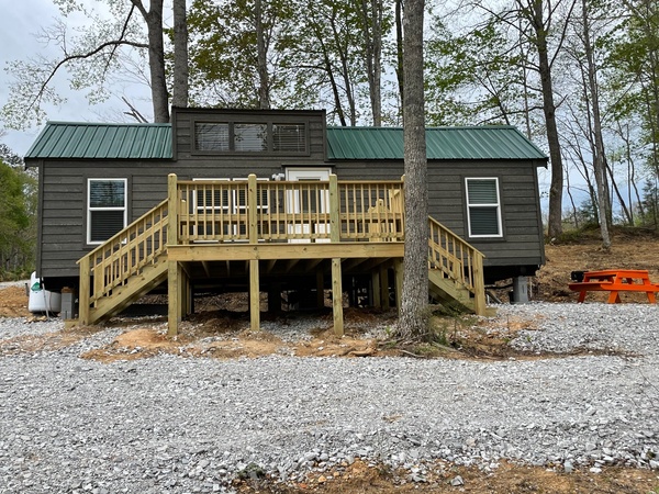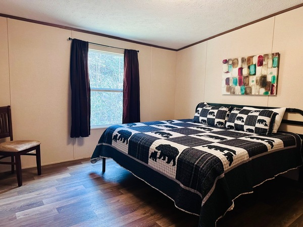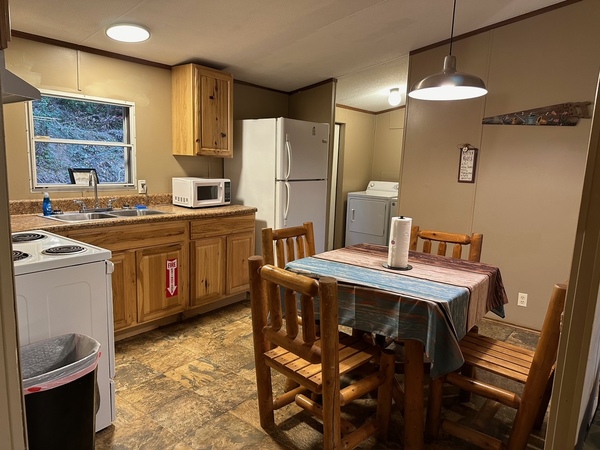 This home has 3 bedrooms and 2 bathrooms, a full modern kitchen, open floor plan, washer/dryer, dishwasher, stove/oven, full size refrigerator, 55 inch TV with Roku capability, charcoal grill, picnic table and fire ring. Unit sleeps 8 with (1) king size bed, 1 queen size bed , (1) Trundle twin size and (2) twin beds. All linens and cooking utensils are provided. Cabin also has a newly built covered front porch. This cabin is also pet friendly. There is a $20 plus tax nonrefundable pet fee per pet per night. Must be crated if left alone on the property. Free Wi-Fi available.