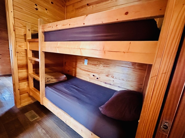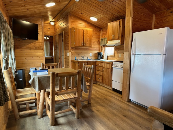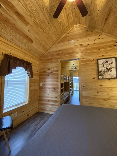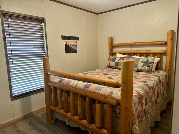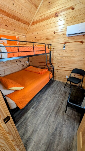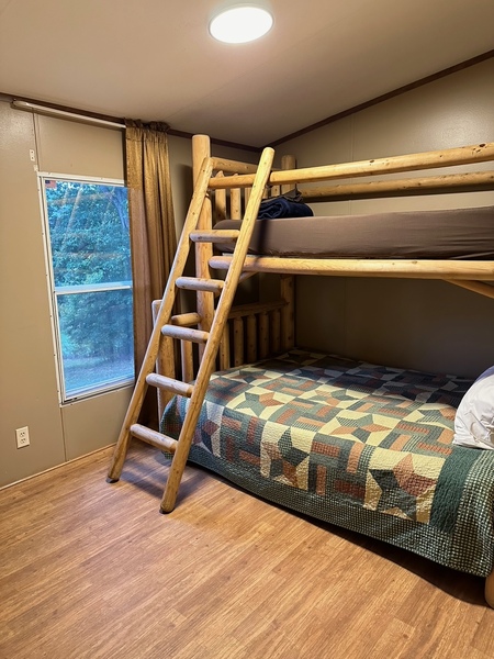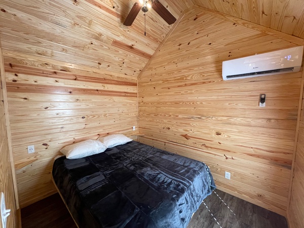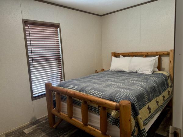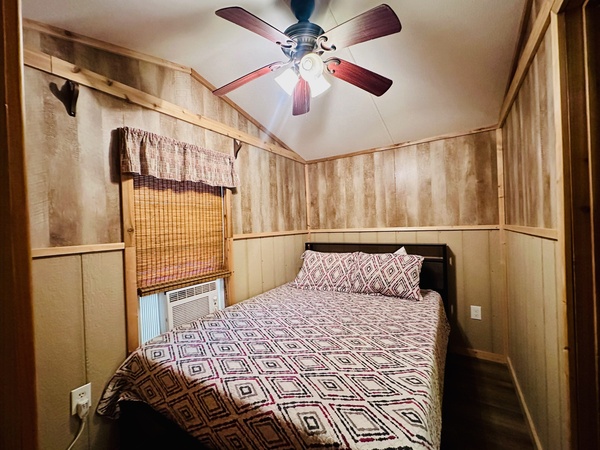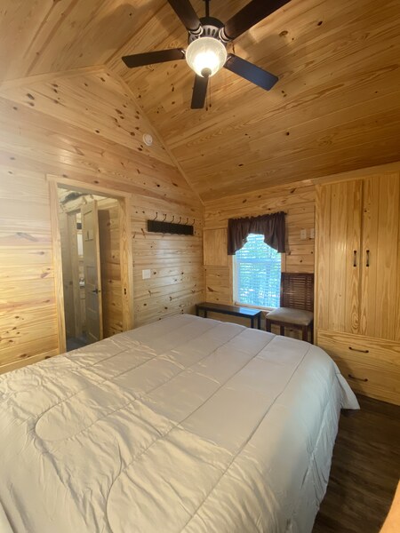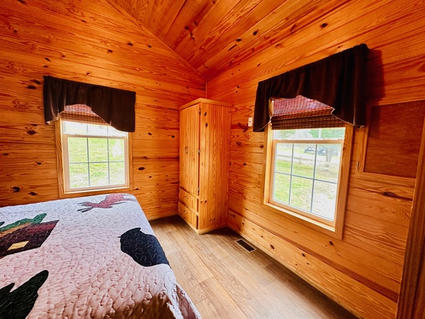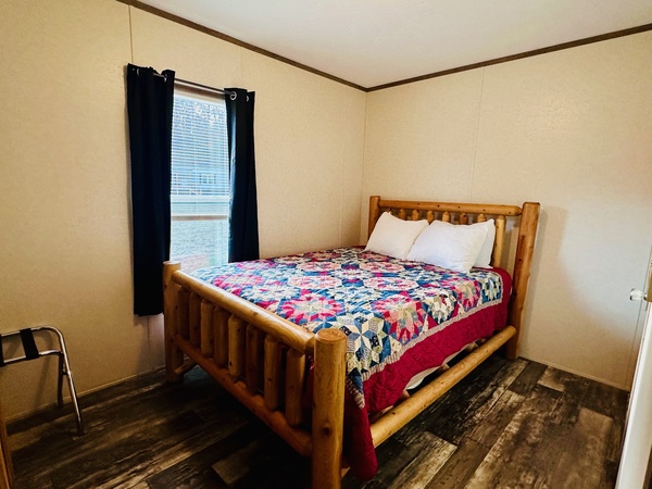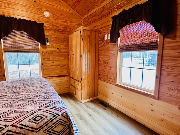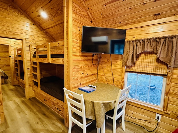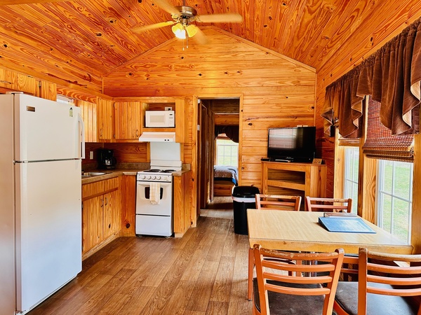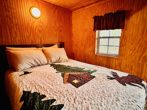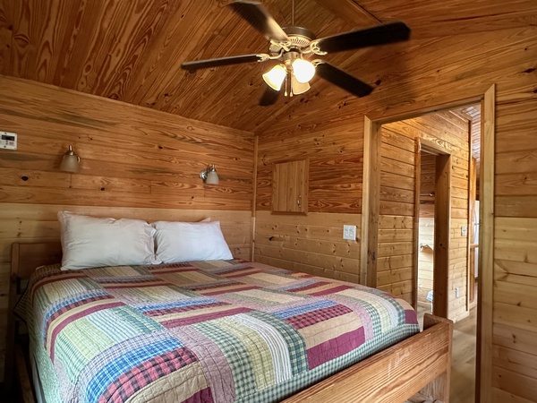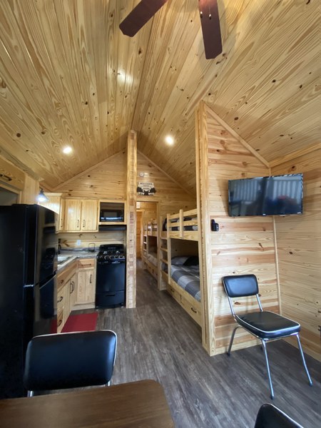 This cabin is across from the main campground. It has one queen size bed with a smart TV and Second bedroom has a bunkbed full over queen. Has a full bathroom, fully equipped kitchen with stove/oven, microwave, full size refrigerator, heat/air, ceiling fans, high cathedral ceilings and a large flat screen Smart TV/with ROKU capability, WIFI, BBQ grill, picnic table and fire ring. Plenty of in-cabin seating available. All linens are furnished. Parking for two vehicles.