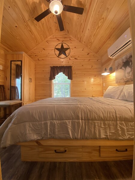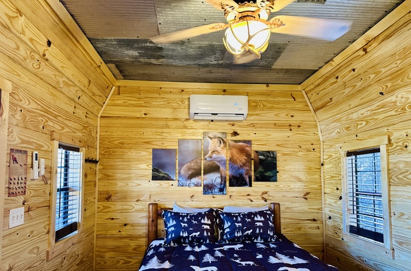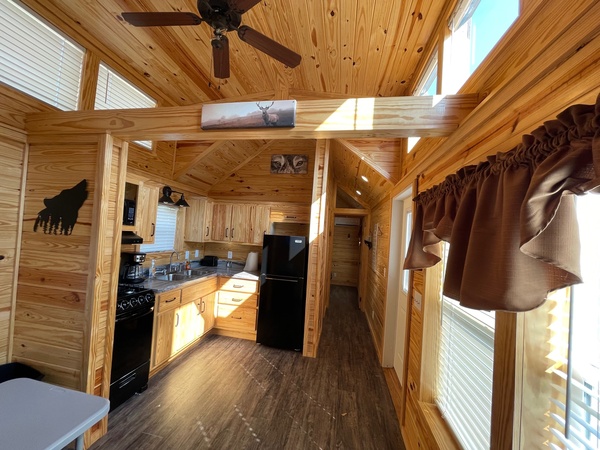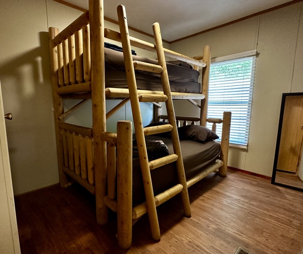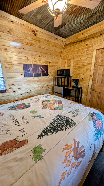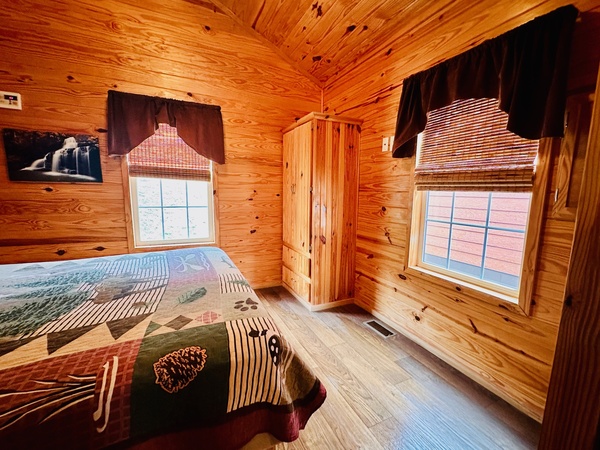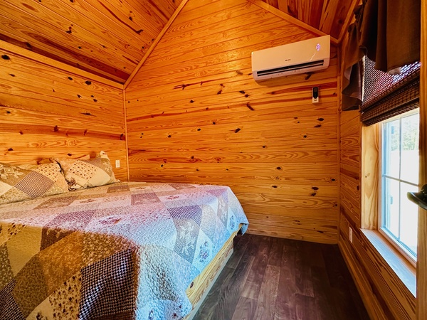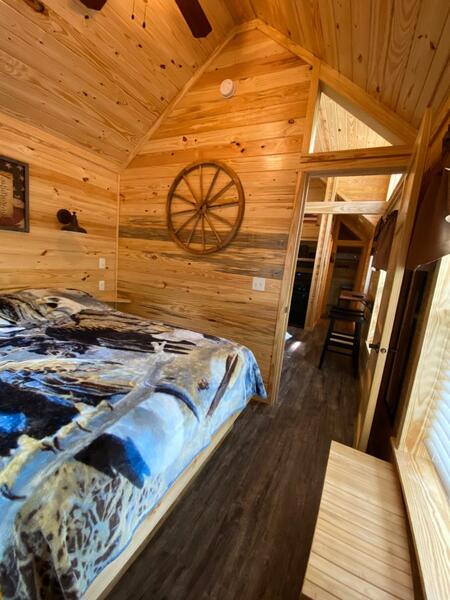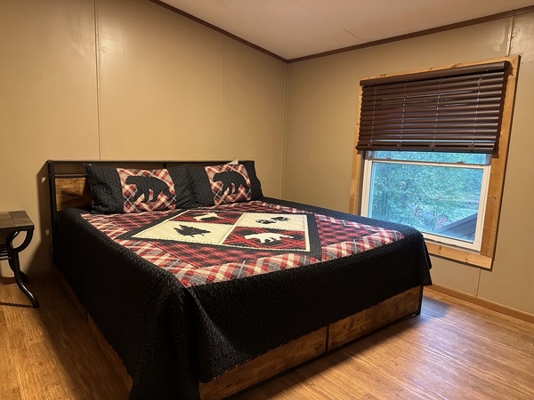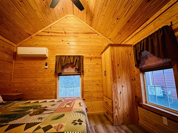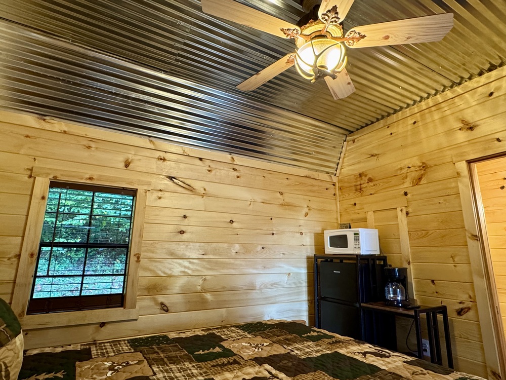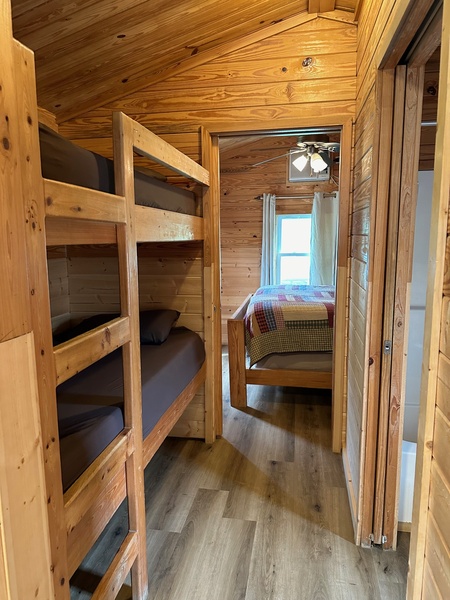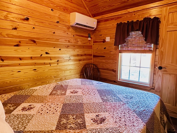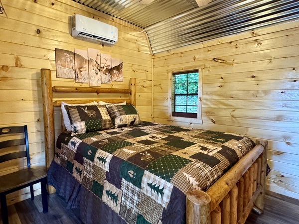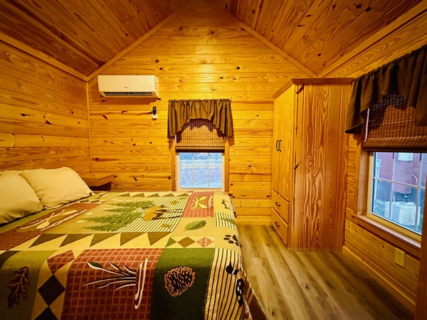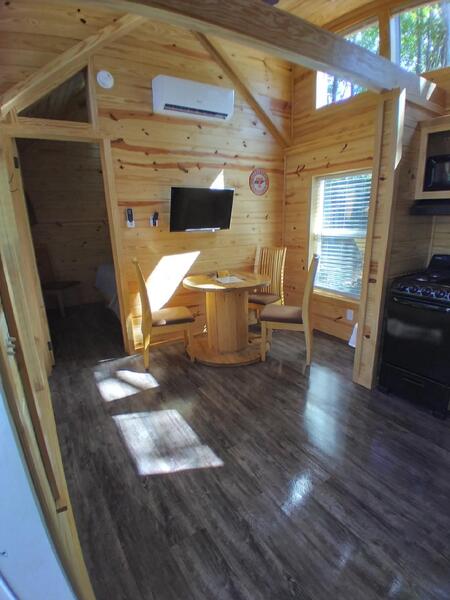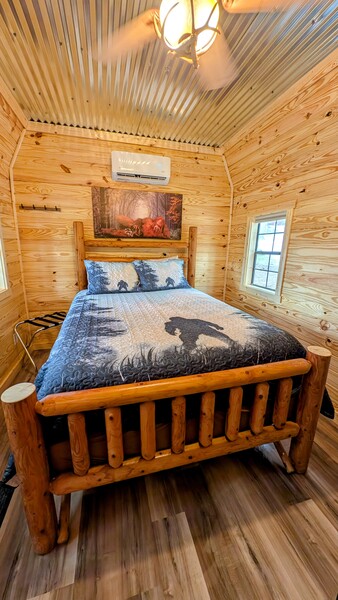 This cabin is across from the main campground. It has one queen size bed with a smart TV and Second bedroom has a bunkbed full over queen. Has a full bathroom, fully equipped kitchen with stove/oven, microwave, full size refrigerator, heat/air, ceiling fans, high cathedral ceilings and a large flat screen Smart TV/with ROKU capability, WIFI, BBQ grill, picnic table and fire ring. Plenty of in-cabin seating available. All linens are furnished. Parking for two vehicles.