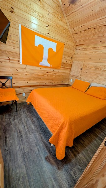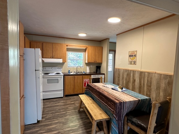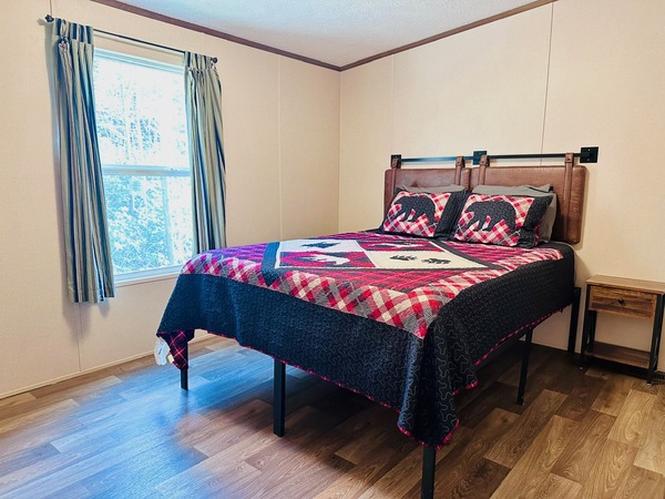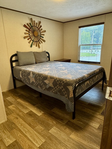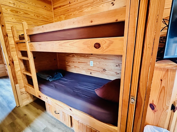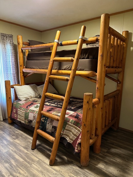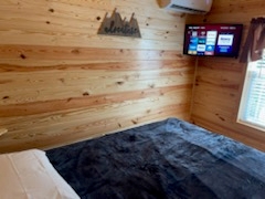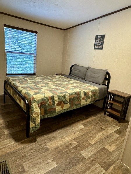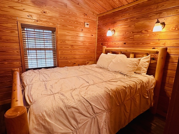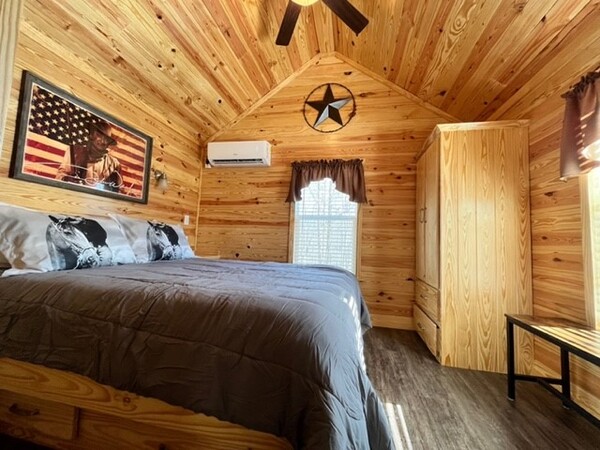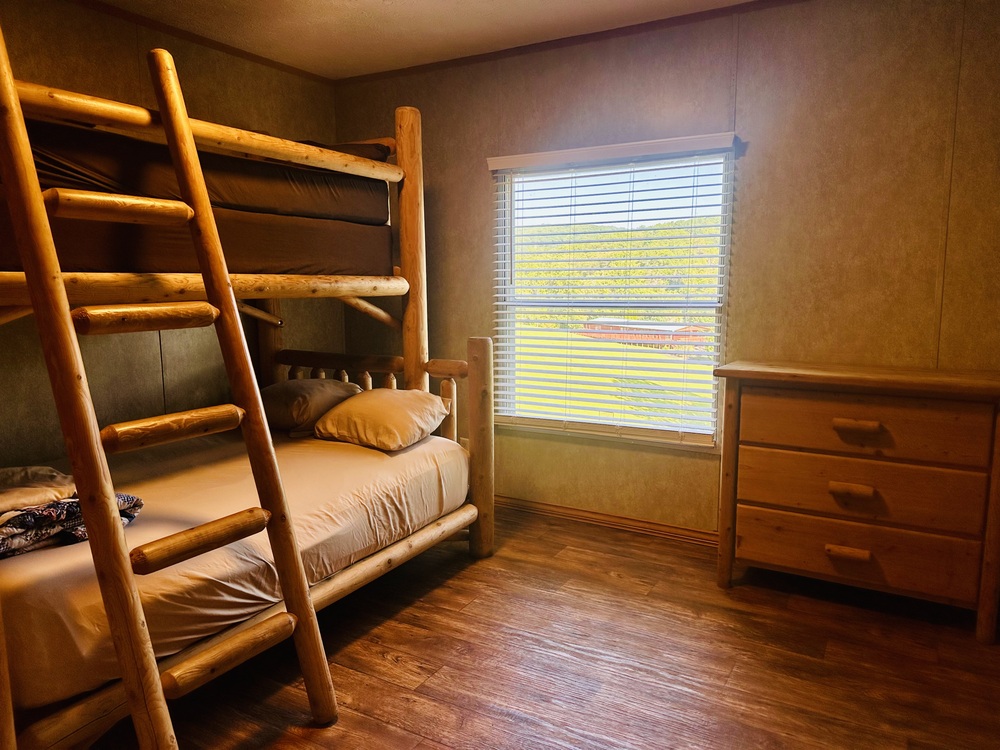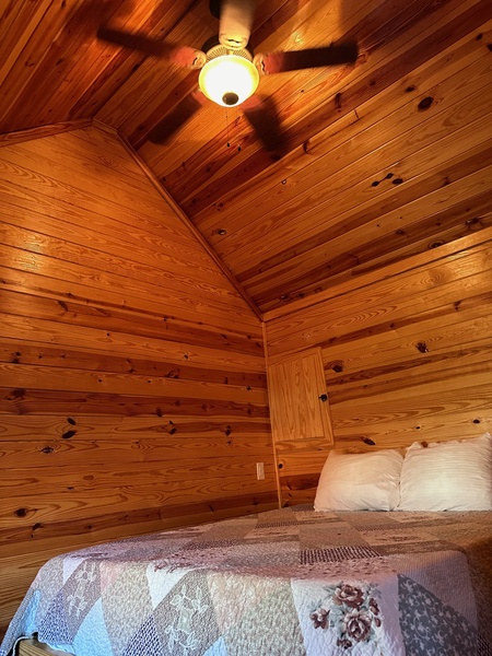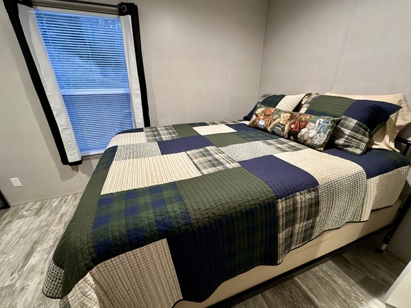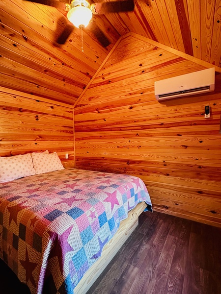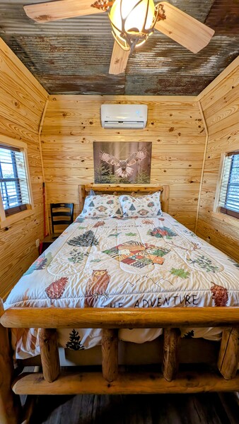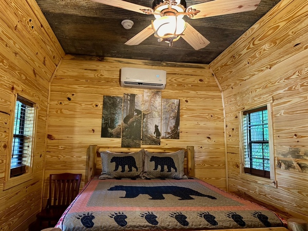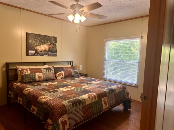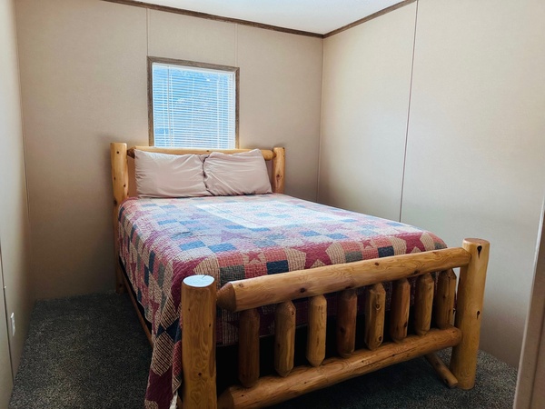 This cabin is across from the main campground. It has one queen size bed with a smart TV and Second bedroom has a bunkbed full over queen. Has a full bathroom, fully equipped kitchen with stove/oven, microwave, full size refrigerator, heat/air, ceiling fans, high cathedral ceilings and a large flat screen Smart TV/with ROKU capability, WIFI, BBQ grill, picnic table and fire ring. Plenty of in-cabin seating available. All linens are furnished. Parking for two vehicles.