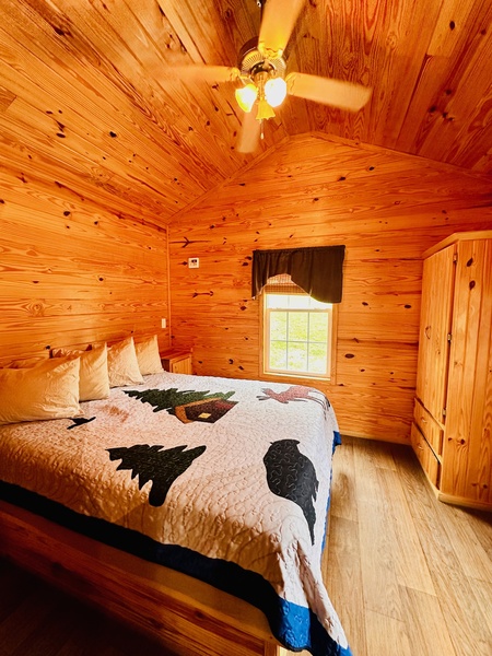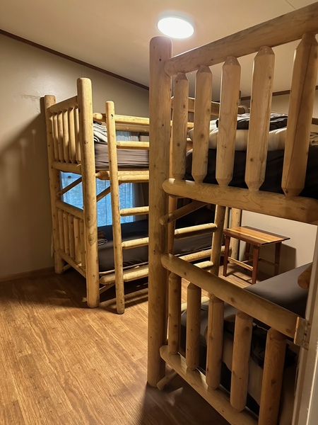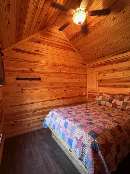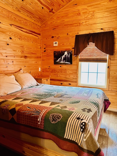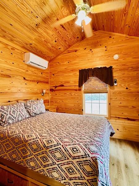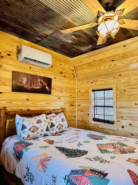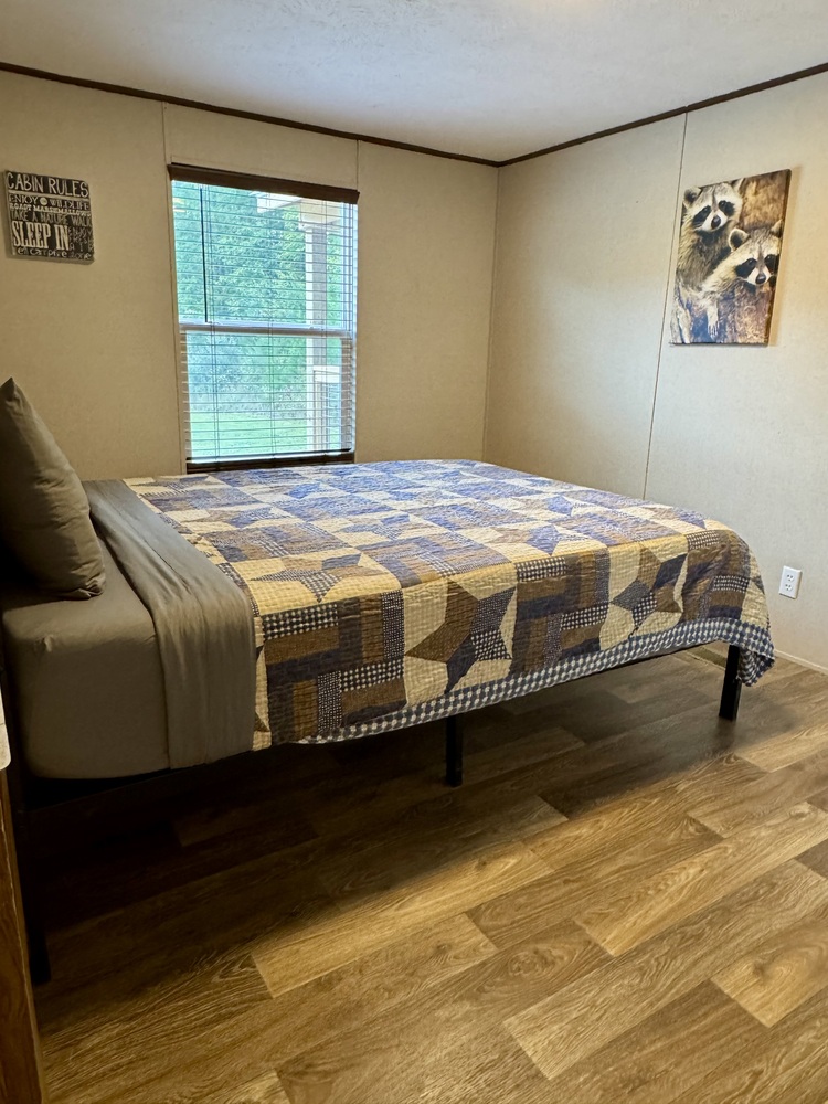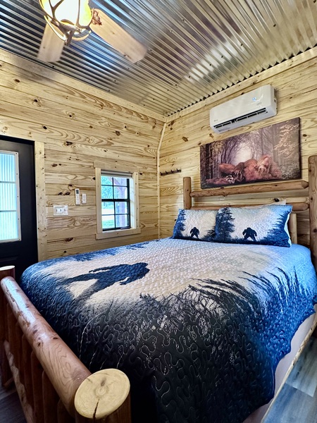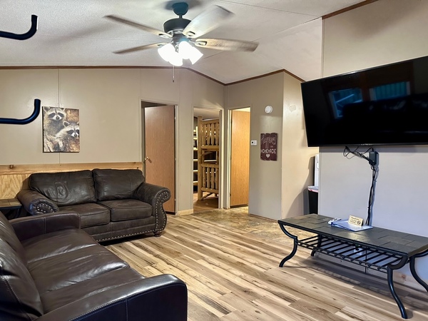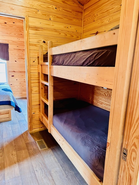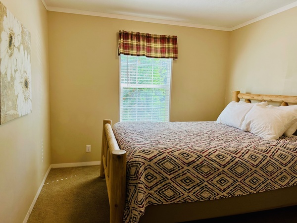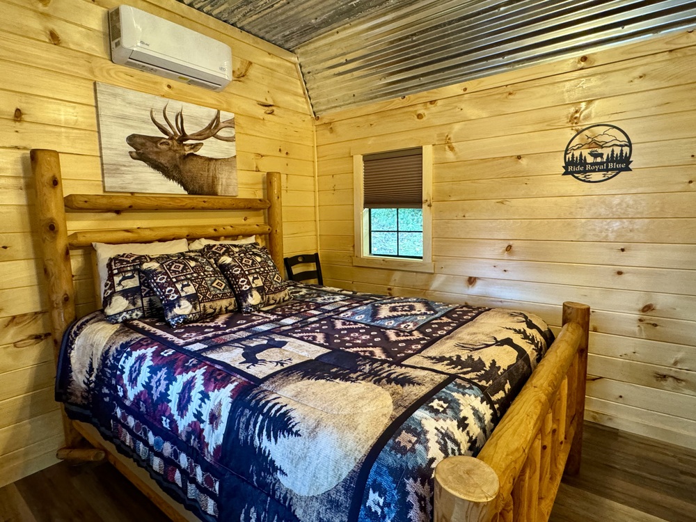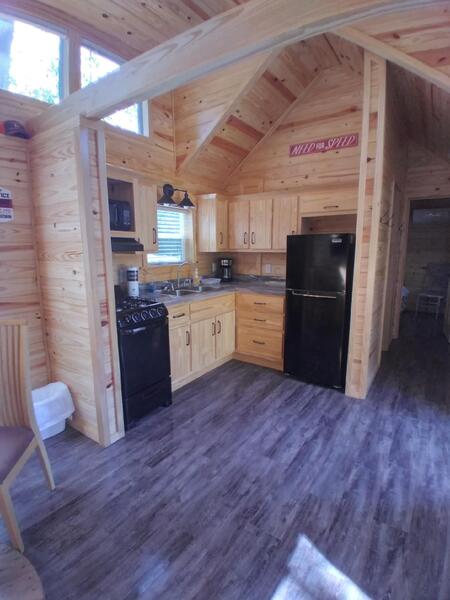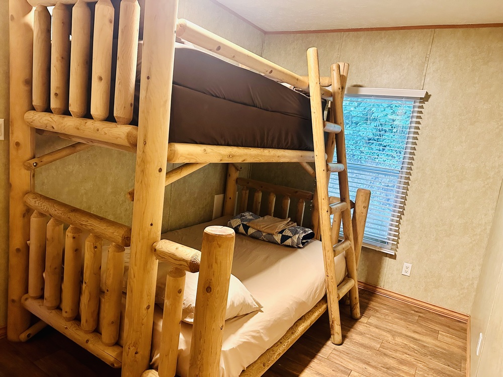 This cabin is across from the main campground. It has one queen size bed with a smart TV and Second bedroom has a bunkbed full over queen. Has a full bathroom, fully equipped kitchen with stove/oven, microwave, full size refrigerator, heat/air, ceiling fans, high cathedral ceilings and a large flat screen Smart TV/with ROKU capability, WIFI, BBQ grill, picnic table and fire ring. Plenty of in-cabin seating available. All linens are furnished. Parking for two vehicles.
