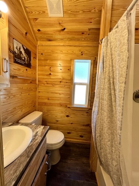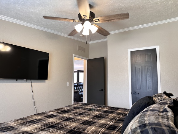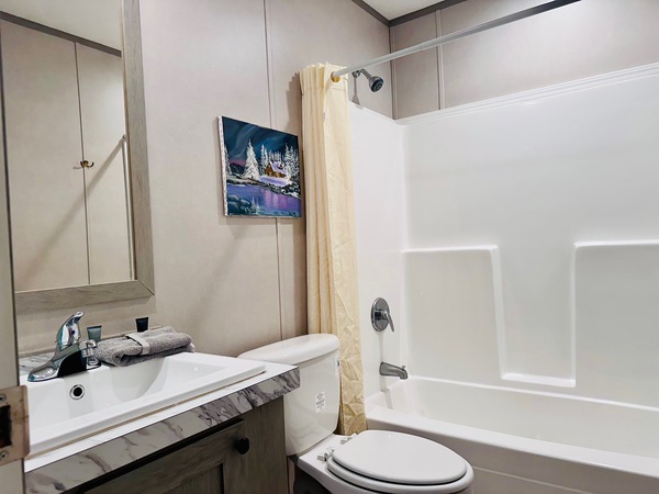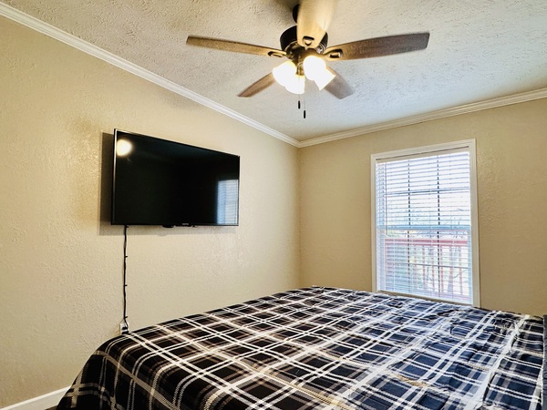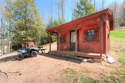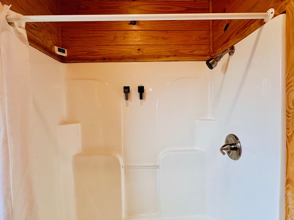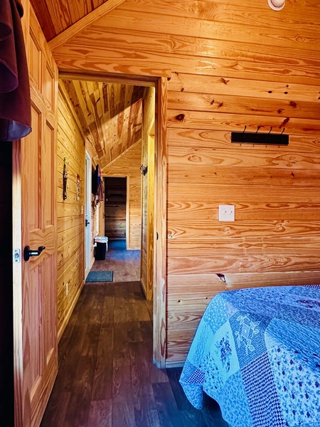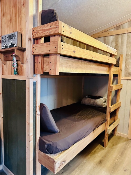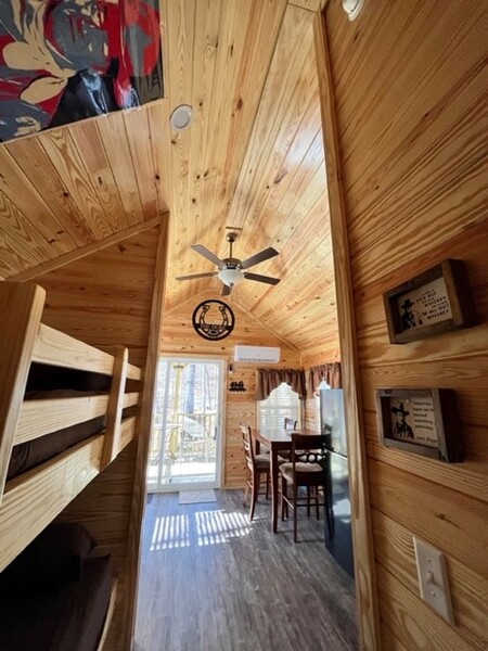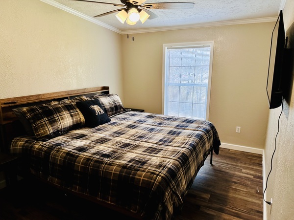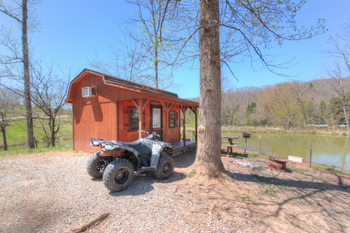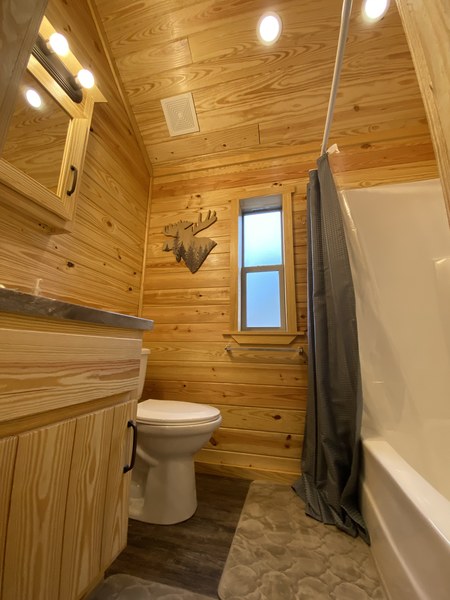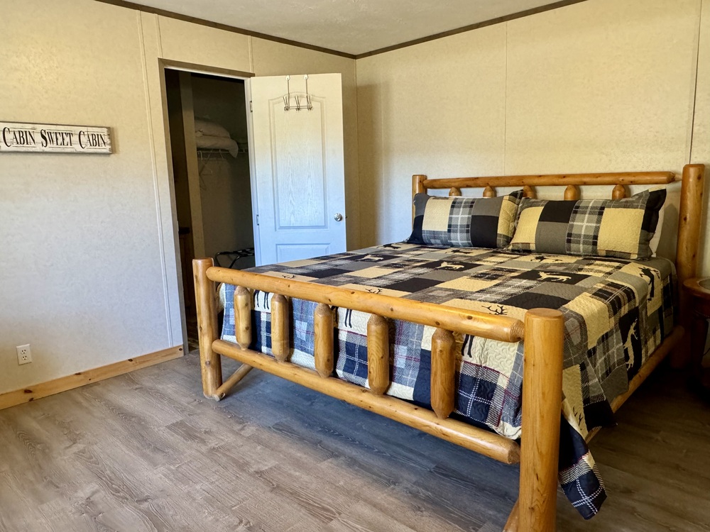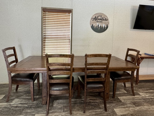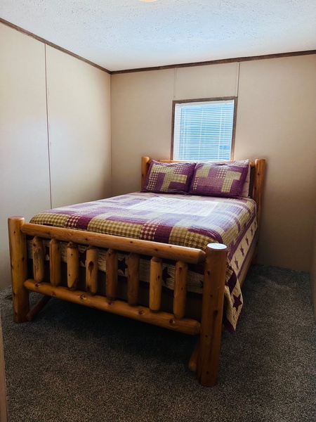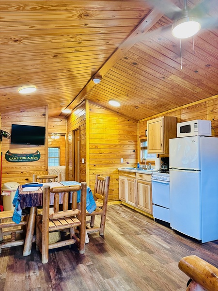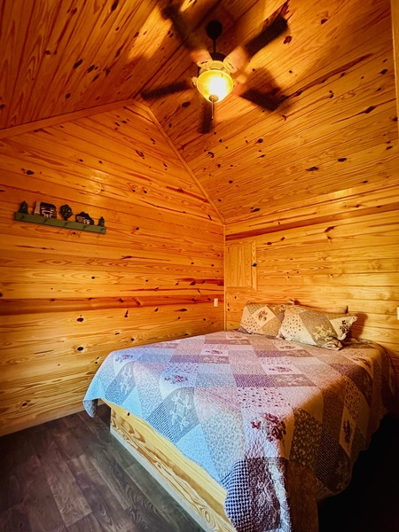 This cabin is across from the main campground. It has one queen size bed with a smart TV and Second bedroom has a bunkbed full over queen. Has a full bathroom, fully equipped kitchen with stove/oven, microwave, full size refrigerator, heat/air, ceiling fans, high cathedral ceilings and a large flat screen Smart TV/with ROKU capability, WIFI, BBQ grill, picnic table and fire ring. Plenty of in-cabin seating available. All linens are furnished. Parking for two vehicles.