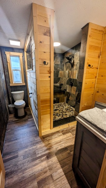 This home has 3 bedrooms and 2 bathrooms, a full modern kitchen, washer/dryer, dishwasher, stove/oven, full size refrigerator, 55 inch TV with Roku streaming capability, charcoal grill, picnic table and fire ring. Unit sleeps 8 with (1) king size log bed, (2) queen size log beds and (1) full size log futon sofa bed. All linens and cooking utensils are provided. This cabin also has a newly added covered front porch. This cabin is also pet friendly. There is a $20 plus tax nonrefundable pet fee per pet per night. Must be crated if left alone on the property. Free Wi-Fi available.