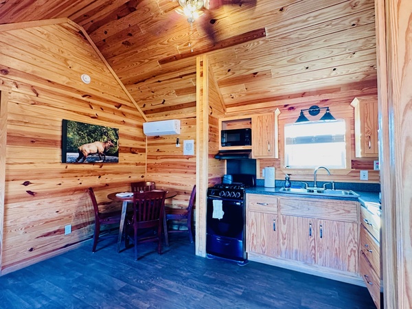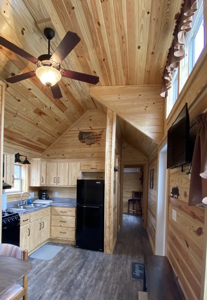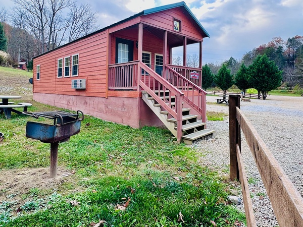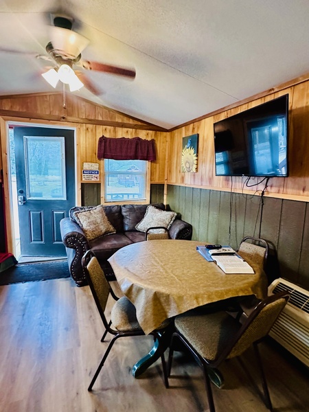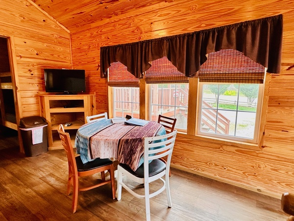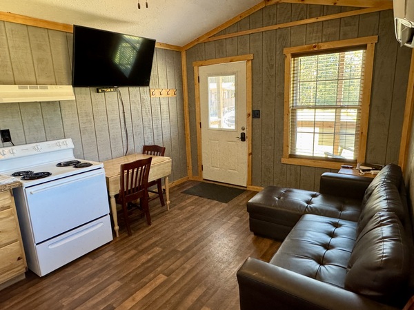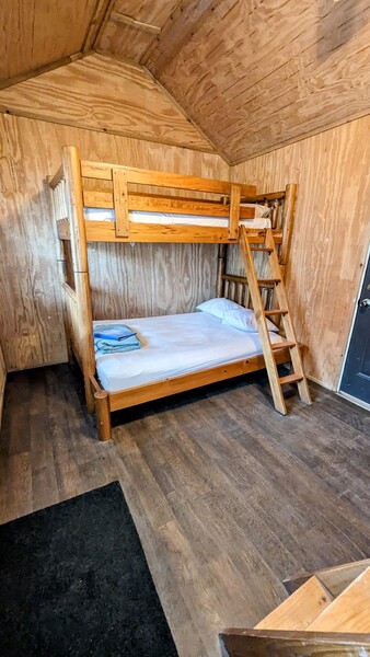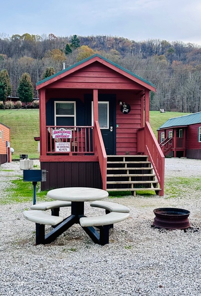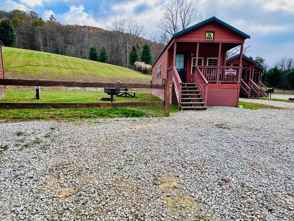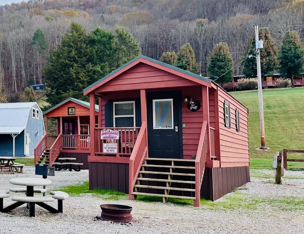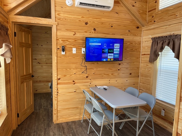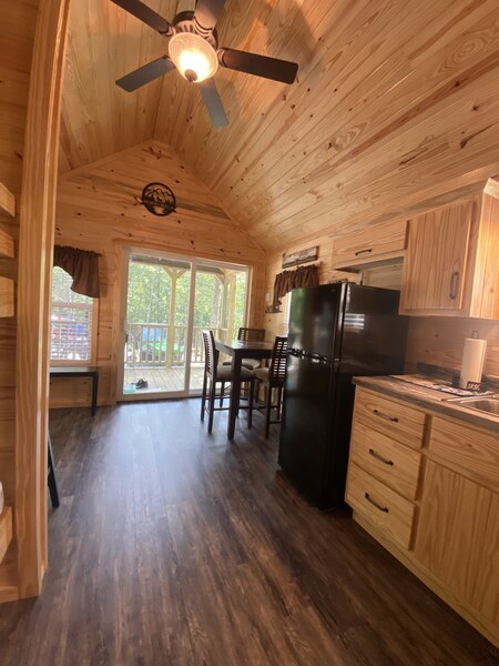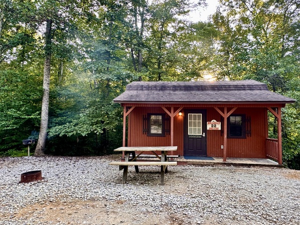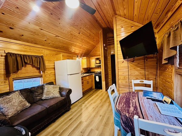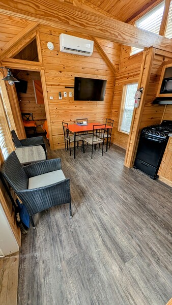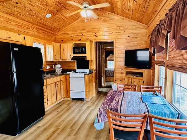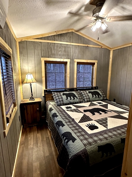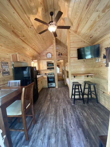 This cabin is across the street from the main campground. It has one queen size bed with a smart TV, and second room has a bunk bed set with full over full bed. Cabin has a full bathroom, fully equipped kitchen with stove/oven, microwave, full size refrigerator, heat/air, ceiling fans, high cathedral ceilings and a large flat screen Smart TV/with ROKU capability, Wifi, BBQ grill, picnic table and fire ring. Plenty of in-cabin seating available. All linens are furnished. Easy parking for 2 vehicles.