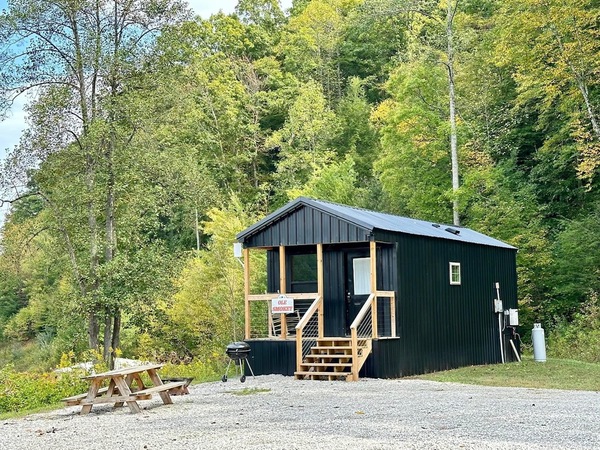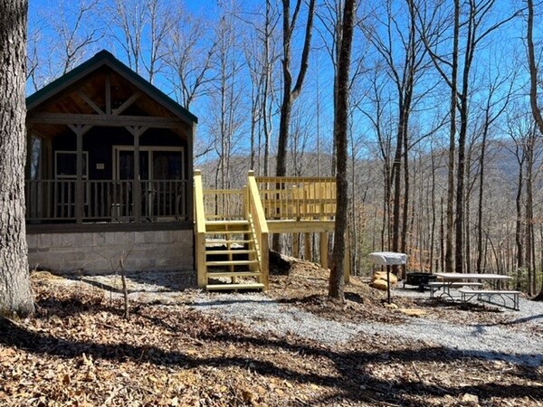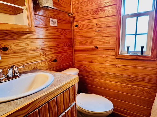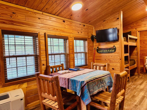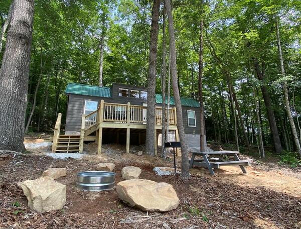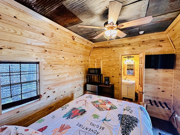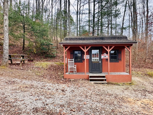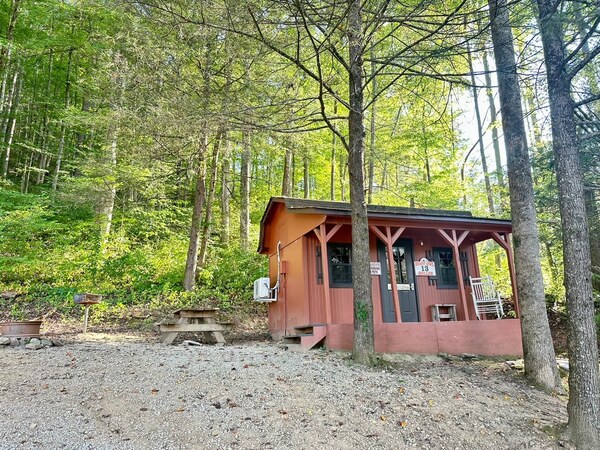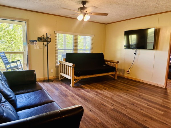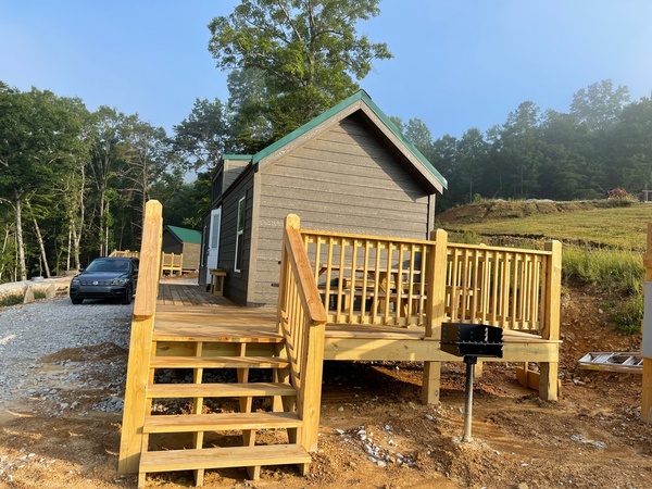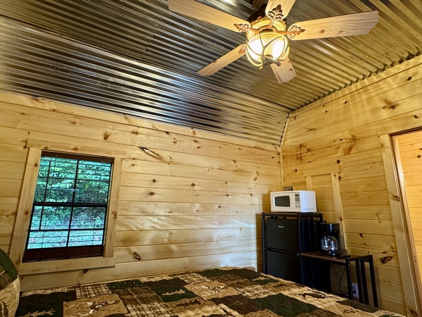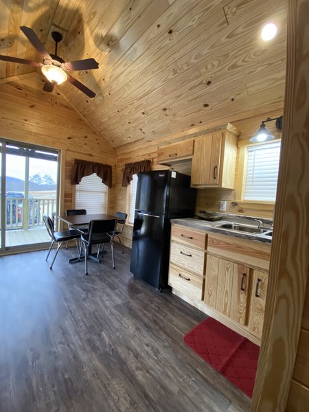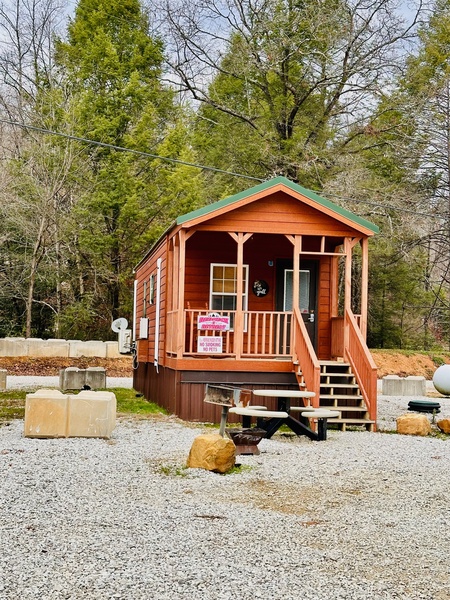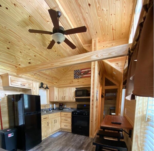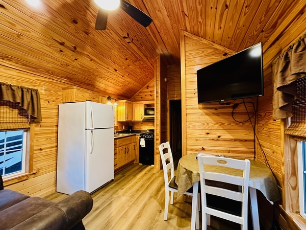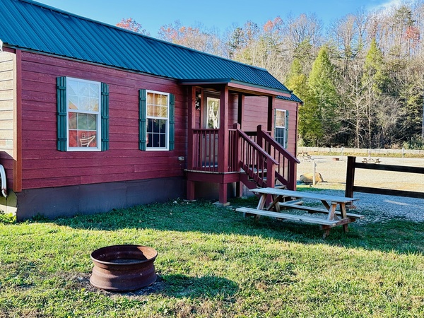 This cabin is across the street from the main campground. It has one queen size bed with a smart TV, and second room has a bunk bed set with full over full bed. Cabin has a full bathroom, fully equipped kitchen with stove/oven, microwave, full size refrigerator, heat/air, ceiling fans, high cathedral ceilings and a large flat screen Smart TV/with ROKU capability, Wifi, BBQ grill, picnic table and fire ring. Plenty of in-cabin seating available. All linens are furnished. Easy parking for 2 vehicles.