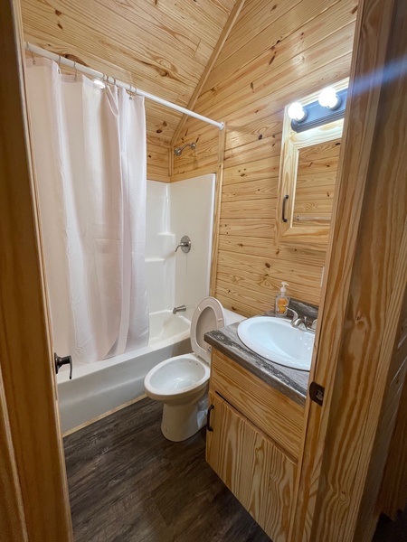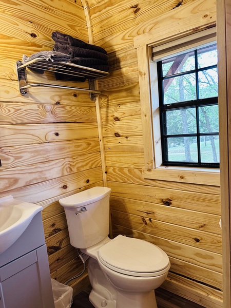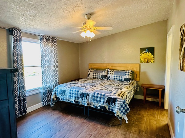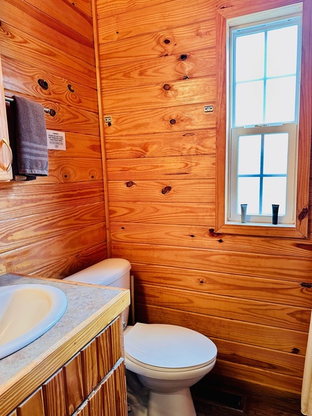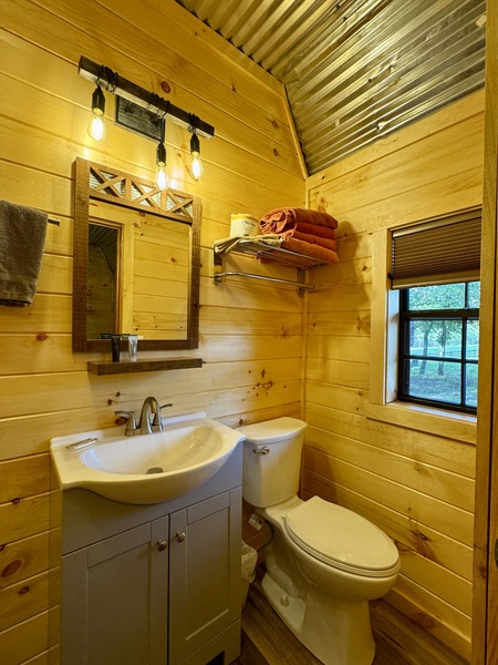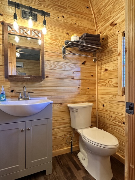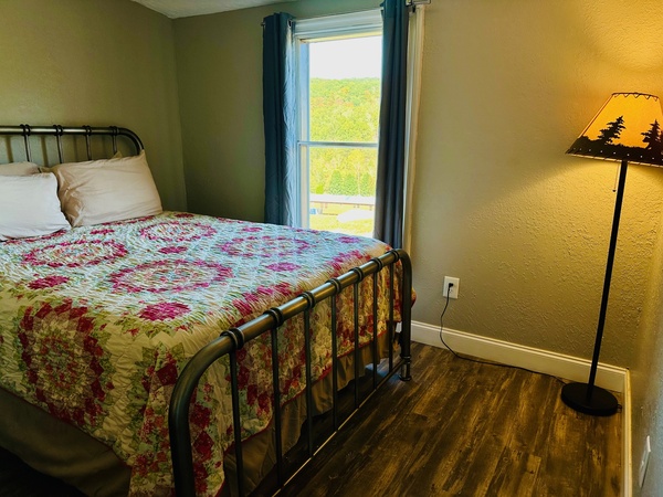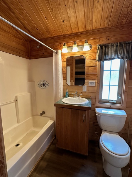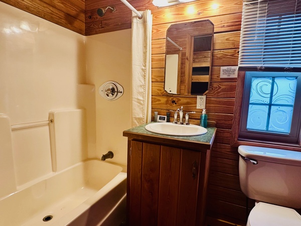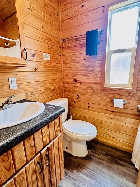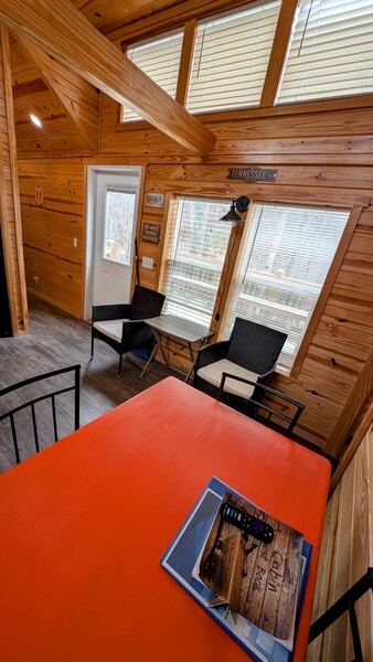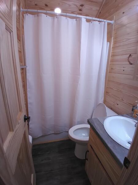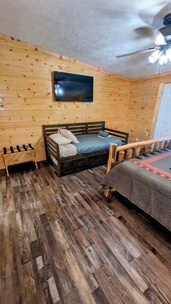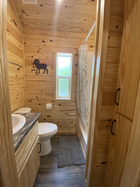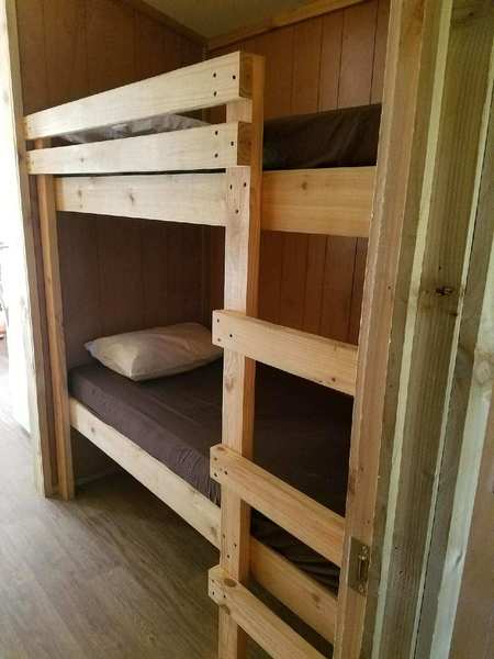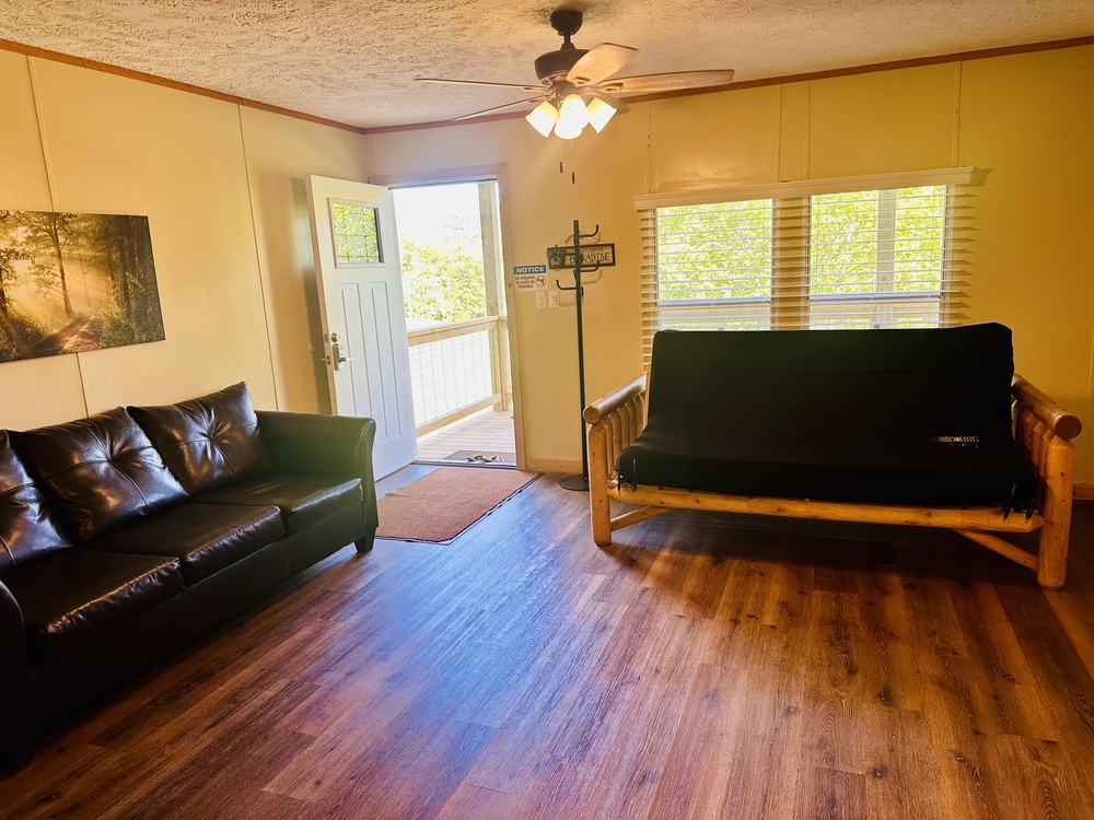 This cabin is across the street from the main campground. It has one queen size bed with a smart TV, and second room has a bunk bed set with full over full bed. Cabin has a full bathroom, fully equipped kitchen with stove/oven, microwave, full size refrigerator, heat/air, ceiling fans, high cathedral ceilings and a large flat screen Smart TV/with ROKU capability, Wifi, BBQ grill, picnic table and fire ring. Plenty of in-cabin seating available. All linens are furnished. Easy parking for 2 vehicles.