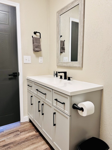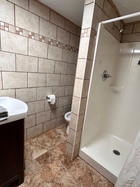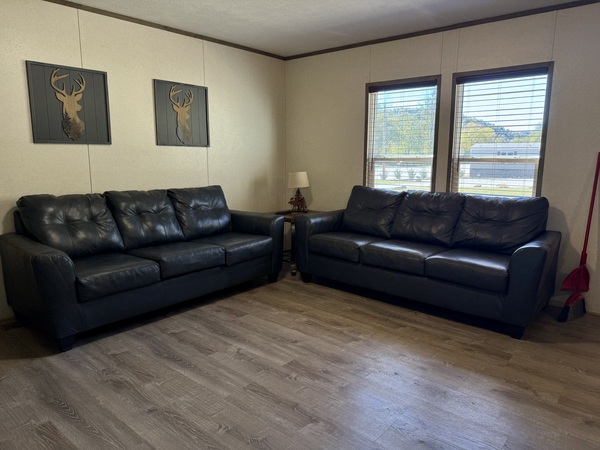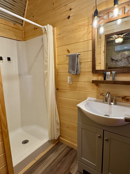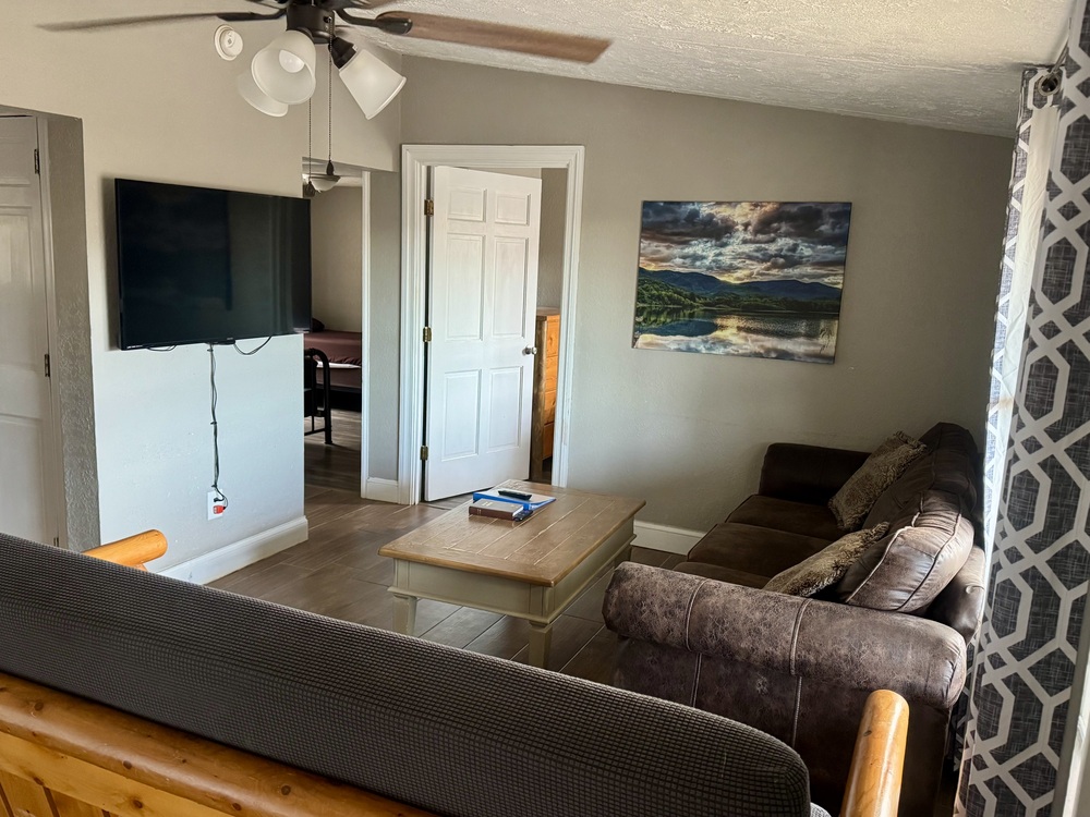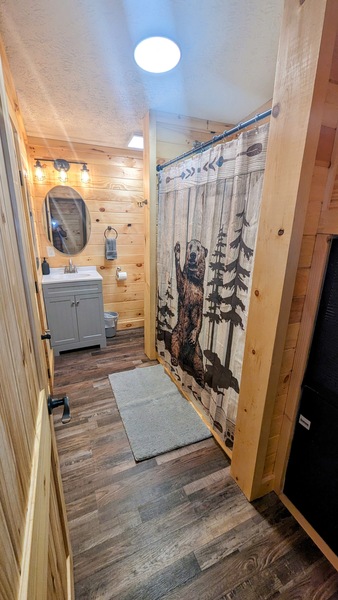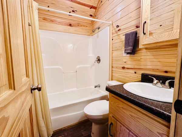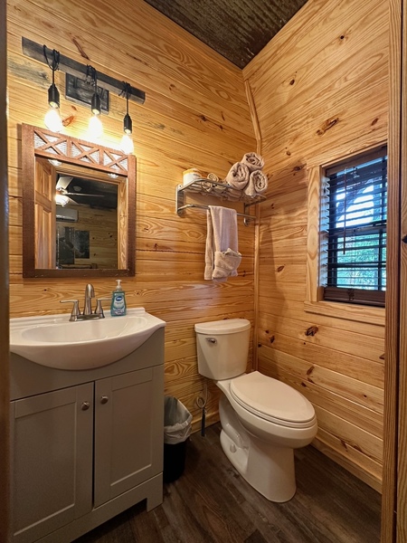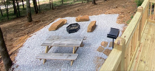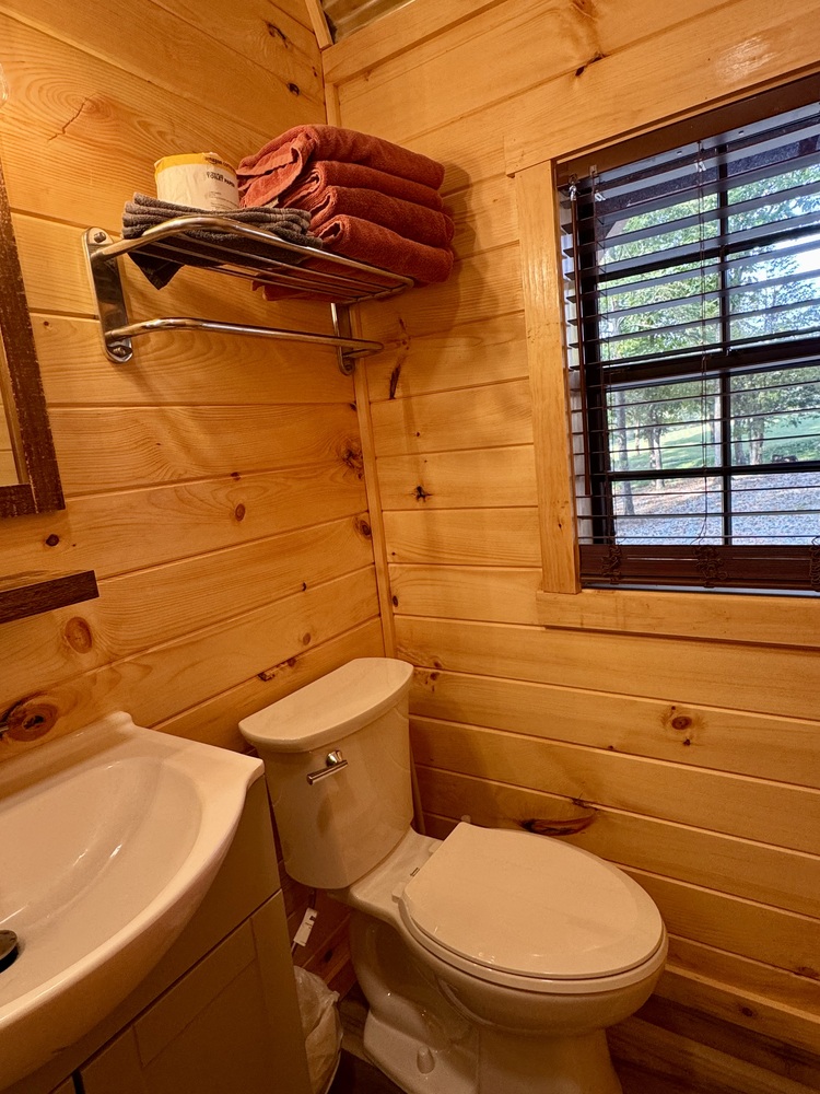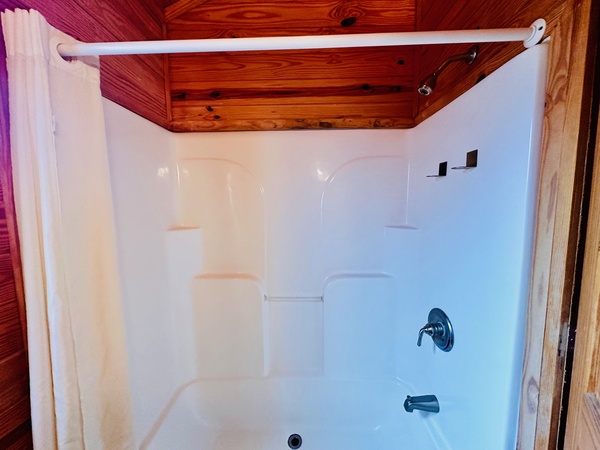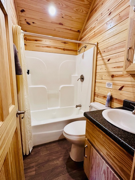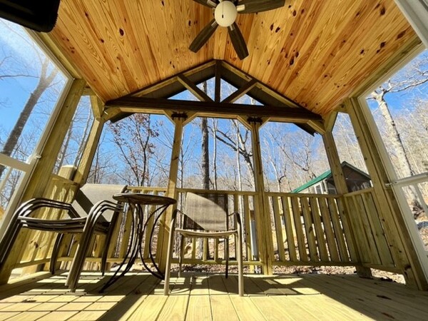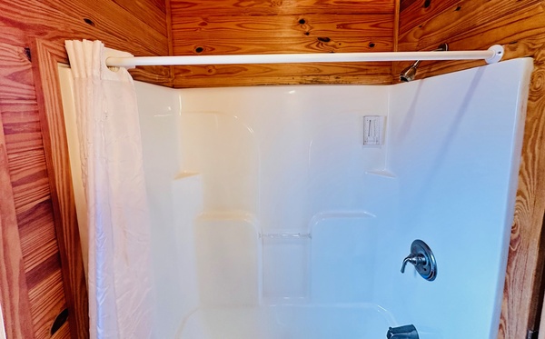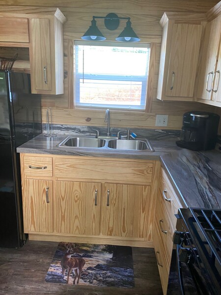 This cabin is across the street from the main campground. It has one queen size bed with a smart TV, and second room has a bunk bed set with full over full bed. Cabin has a full bathroom, fully equipped kitchen with stove/oven, microwave, full size refrigerator, heat/air, ceiling fans, high cathedral ceilings and a large flat screen Smart TV/with ROKU capability, Wifi, BBQ grill, picnic table and fire ring. Plenty of in-cabin seating available. All linens are furnished. Easy parking for 2 vehicles.