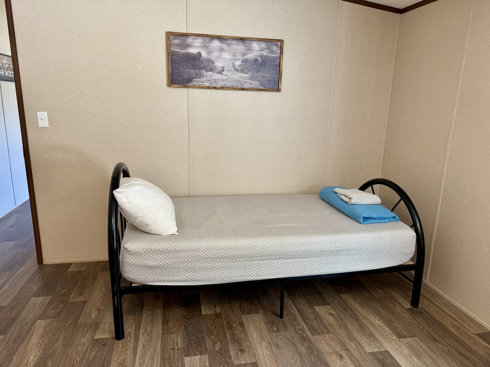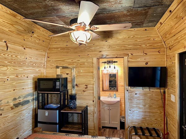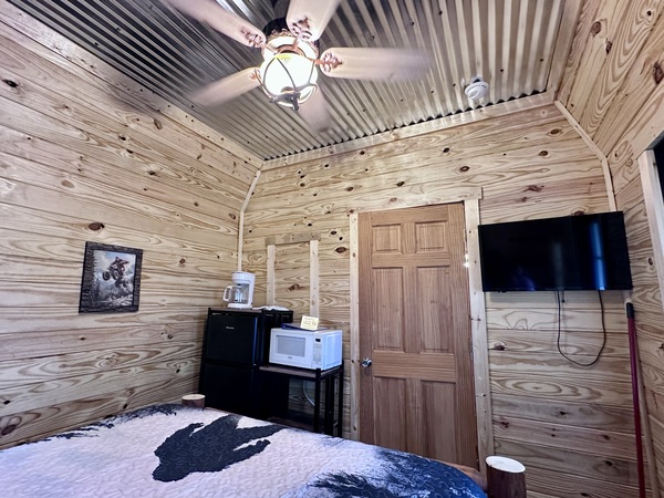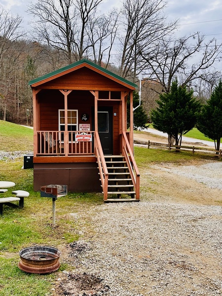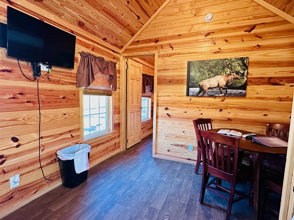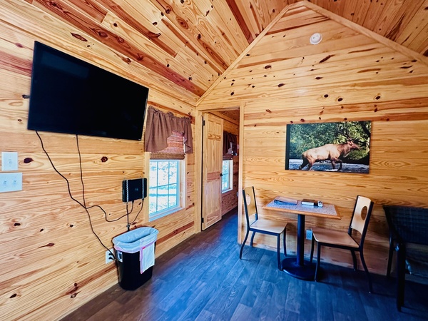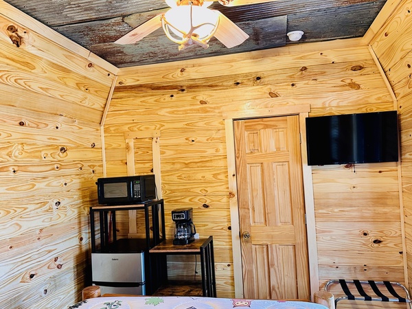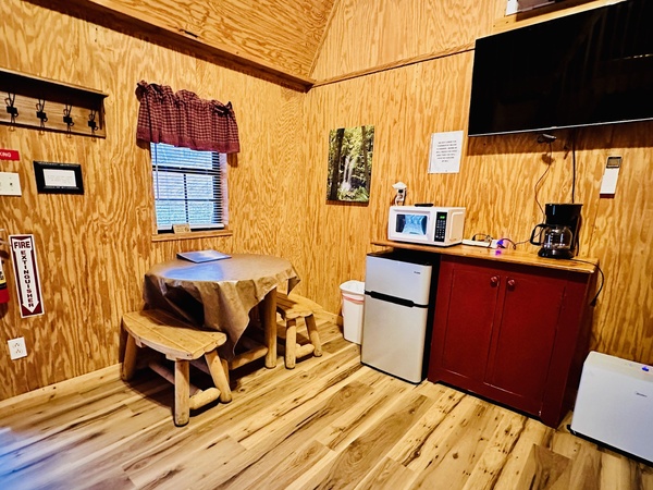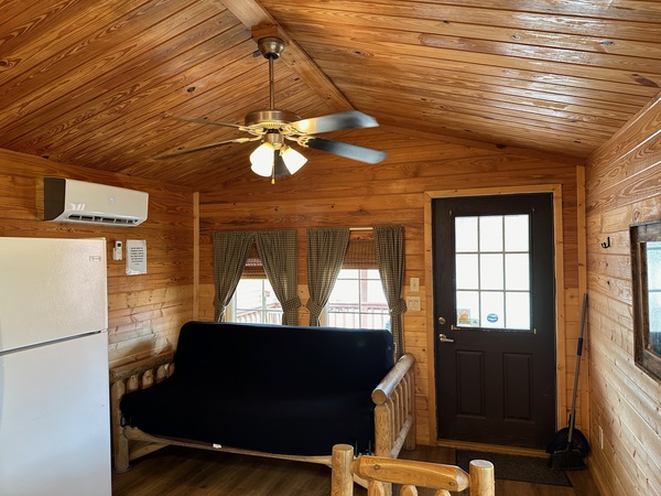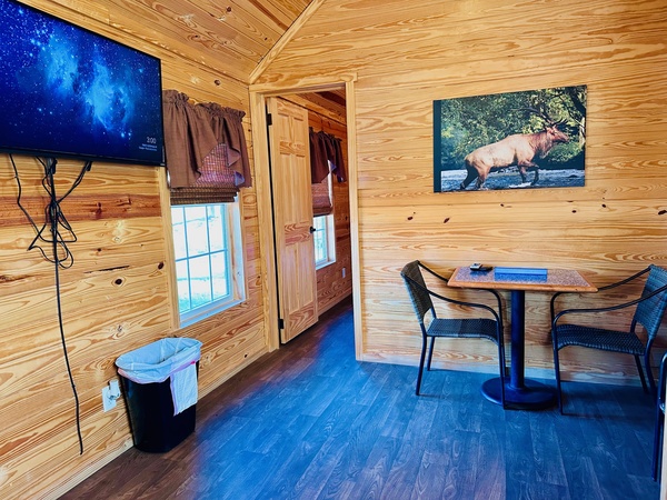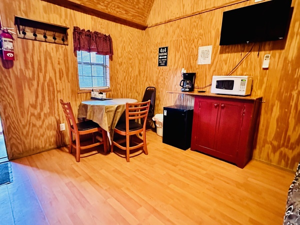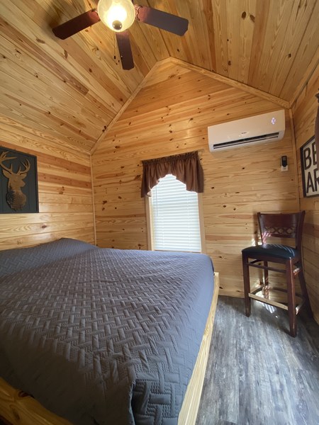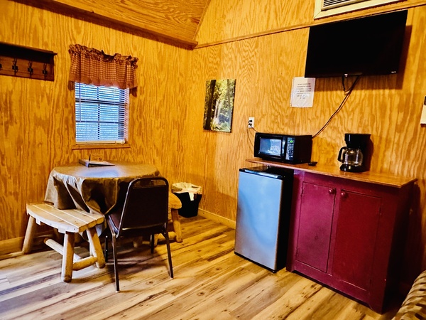 These cozy one room cabin sleeps 6 people with 2 full beds and 2 twin beds. Cabin has heat/air, Bed linens only are provided and there is no indoor plumbing. These cabins are adjacent to our private entrance bath house. Free Wi-Fi available. This cabin is also pet friendly. There is a $20 plus tax nonrefundable pet fee per pet per night. Must be crated if left alone on the property. Maximum occupancy per site is limited to 6 people. Each site is limited to one vehicle and one trailer. Additional parking is available in our overflow lot by permit only at a rate of $10 per day.