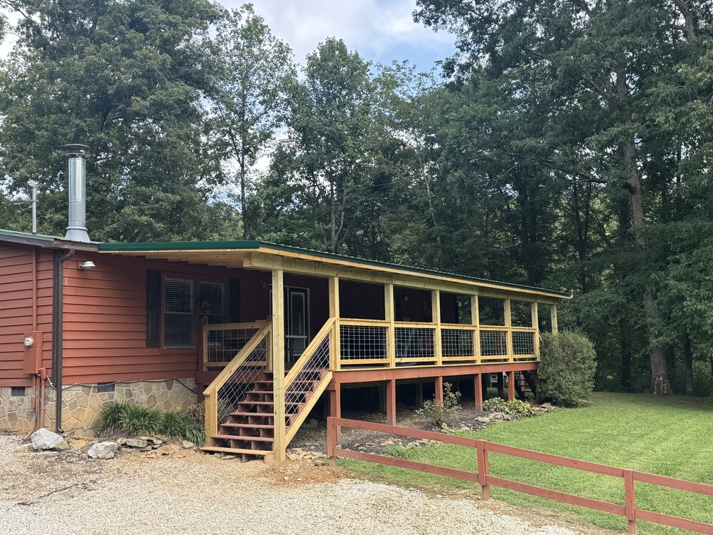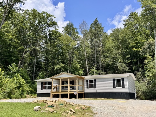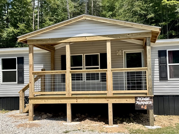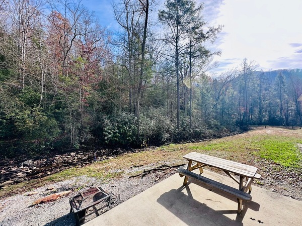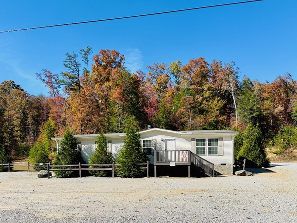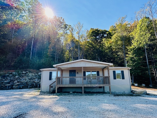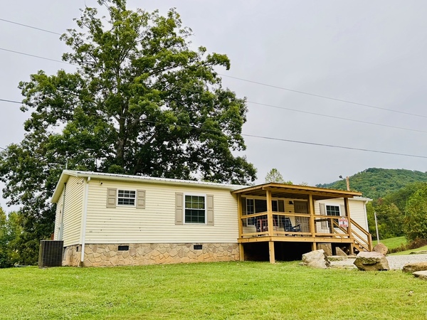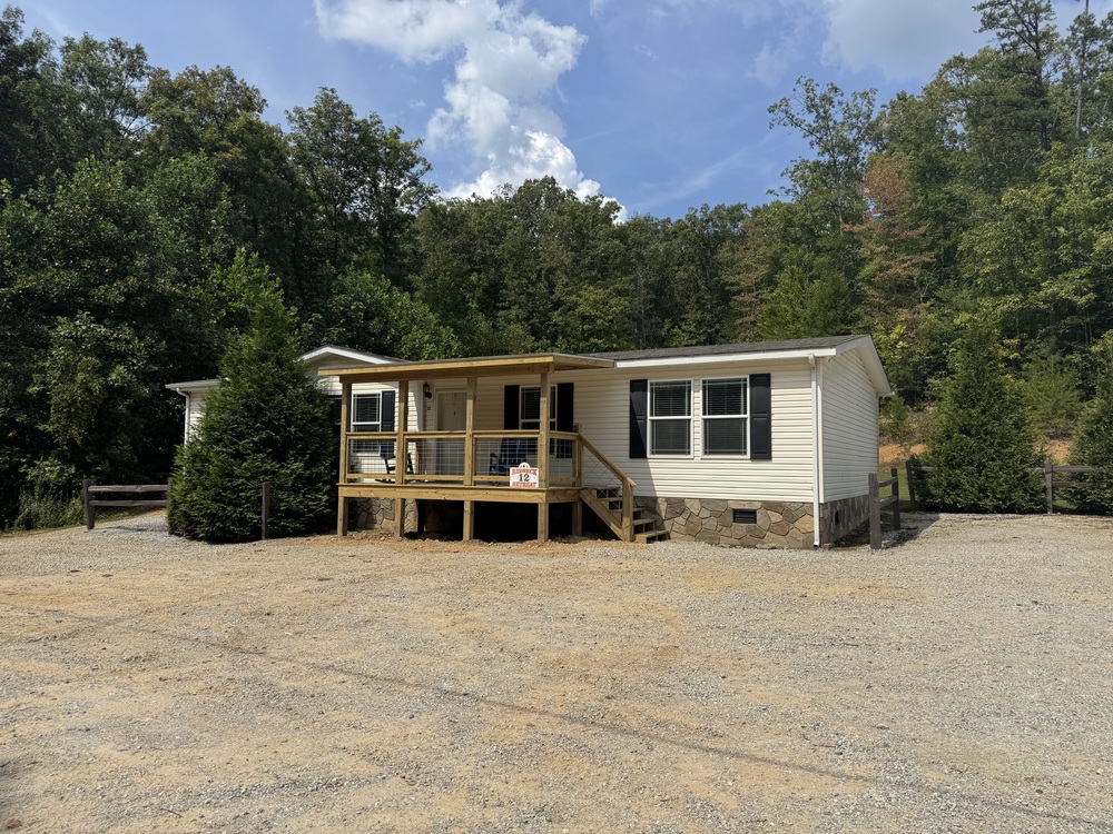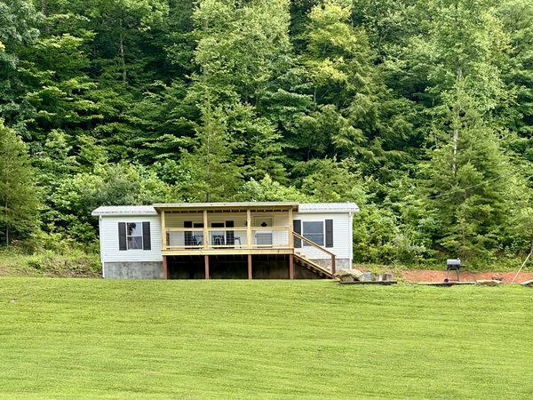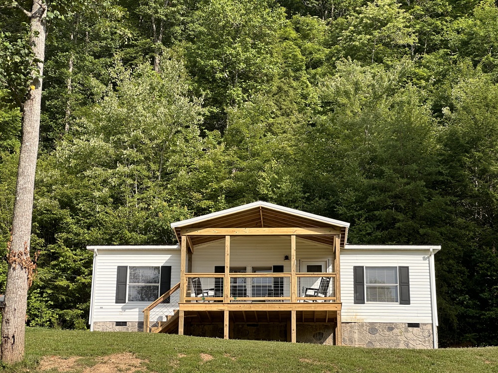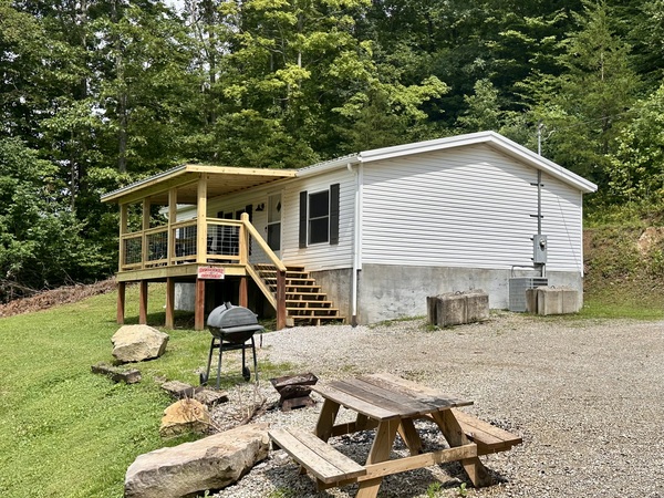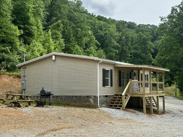 This is a four bedroom home that sits beside a beautiful rambling creek, off the road and very private. There is another home, Ridge 5, that is close and the two can accommodate large groups. This home has 2 full bathrooms, huge fully functional kitchen with all amenities, washer, dryer, microwave, full size refrigerator, large screen TV that is ROKU streaming capability, rear concrete patio, picnic table, fire ring and charcoal grill. The home sleeps 8 with 1 king size bed, and 3 queen beds. All linens are furnished. Free Wi-Fi available. Newly added covered front porch.