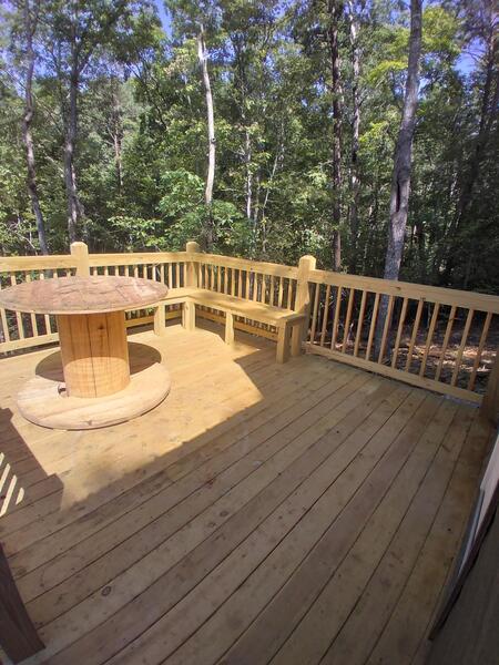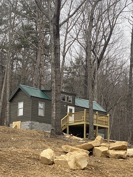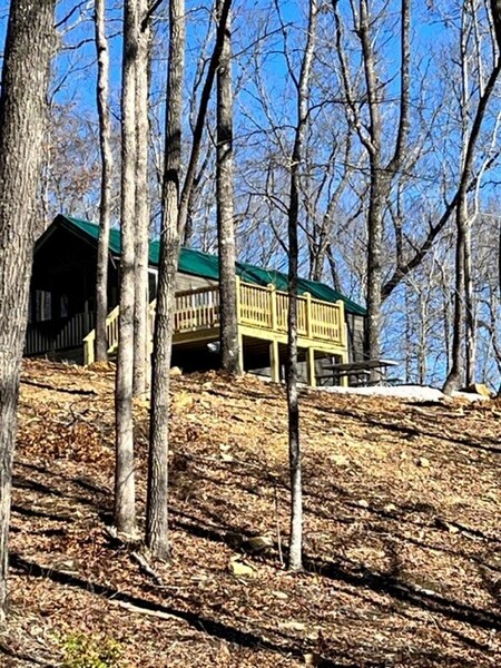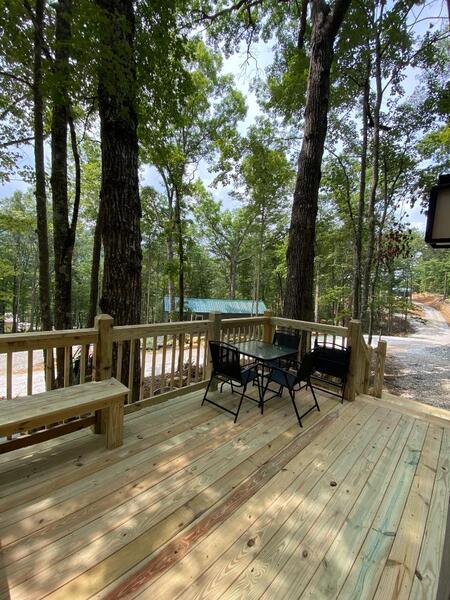 This cabin is across the street from the main campground. It has two separate bedrooms with queen size beds, full bathroom, fully equipped kitchen with stove/oven, full size refrigerator, table with four chairs, heat/air, ceiling fans in each room, high cathedral ceilings with tons of light, and a flat screen TV with ROKU capability, BBQ grill, picnic table, fire ring and a beautiful extensive deck. All linens are furnished. Parking for two vehicles. Does not have Wi-Fi.