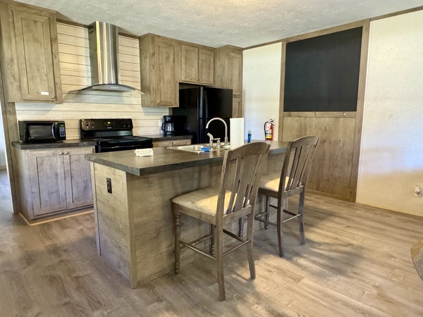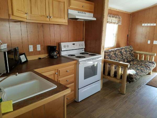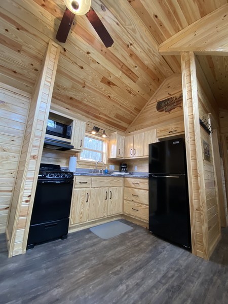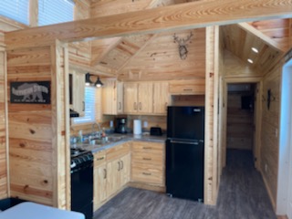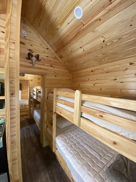 This cabin sleeps 6 and has a rear private bedroom with a queen bed and 4 midway twin beds. It has heat/air, full bathroom, and full kitchen with stove/oven, microwave, coffee maker, all cookware/utensils and Roku enabled smart TV. Linens are furnished. This cabin is also pet friendly. There is a $20 plus tax nonrefundable pet fee per pet per night. Must be crated if left alone on the property. Free Wi-Fi available. Each site is limited to one vehicle and one trailer. Additional parking is available in our overflow lot by permit only.