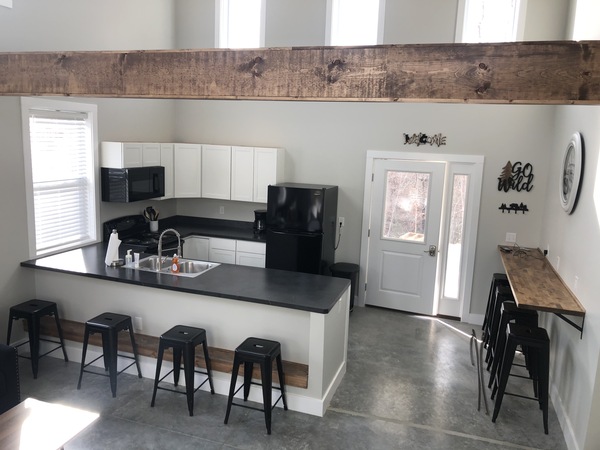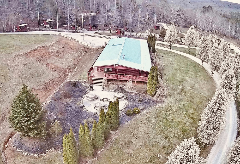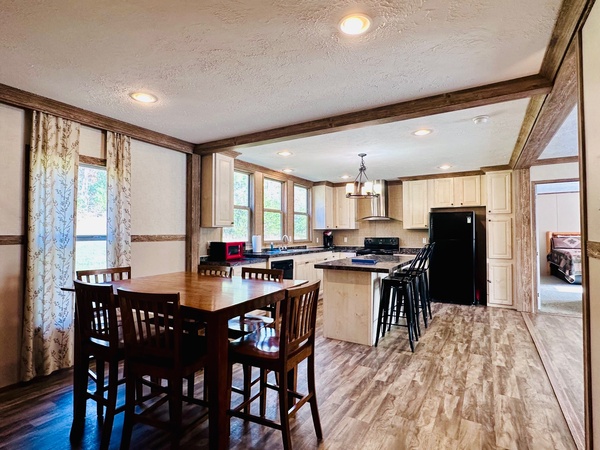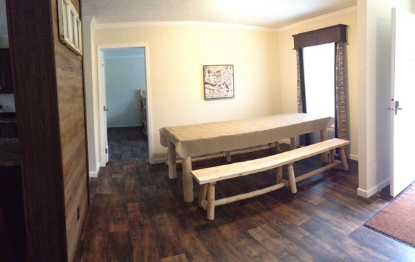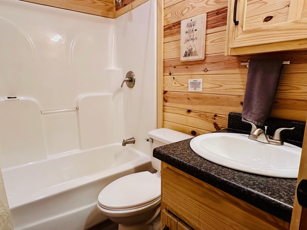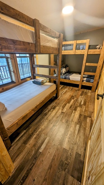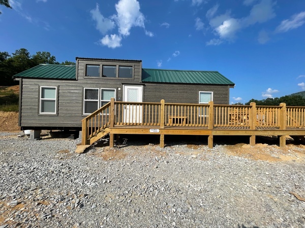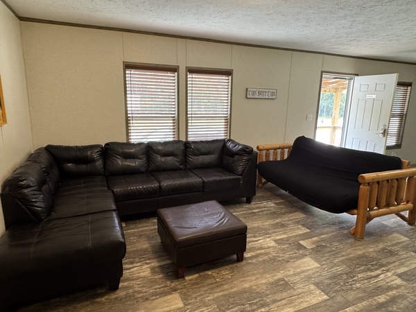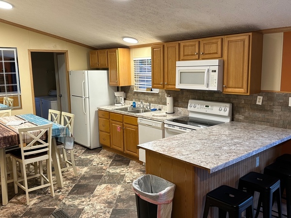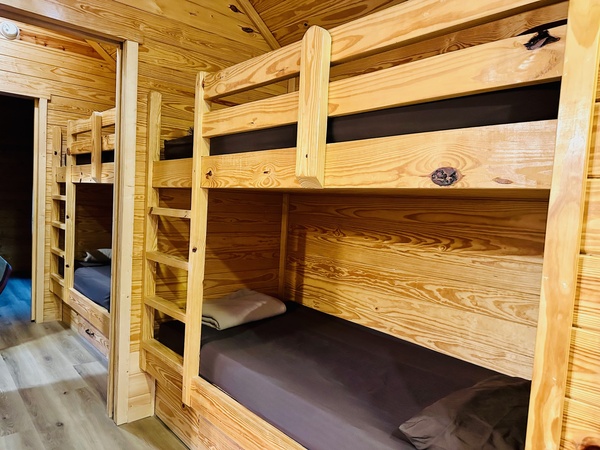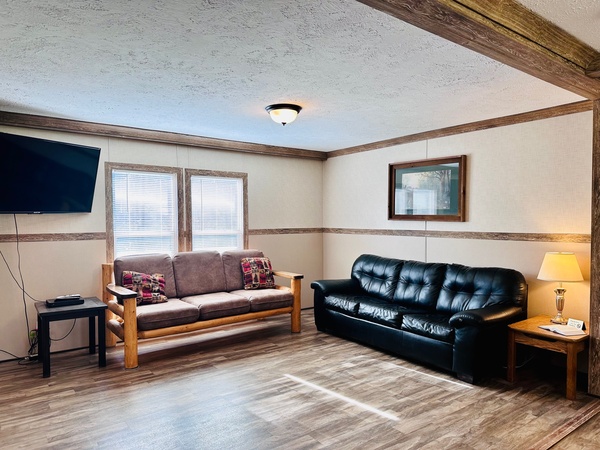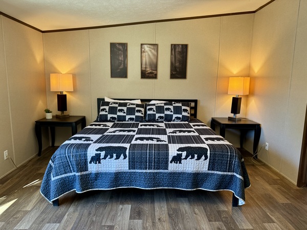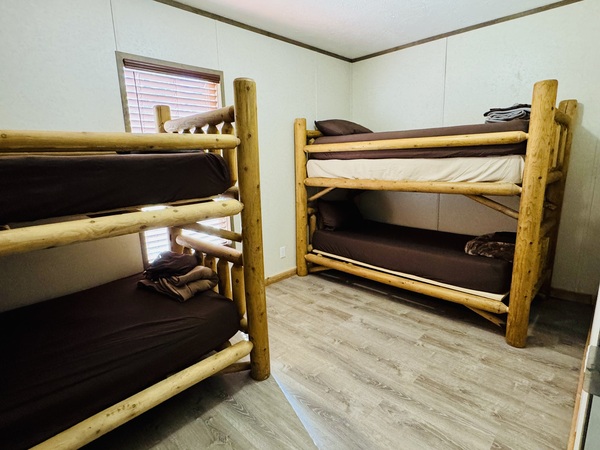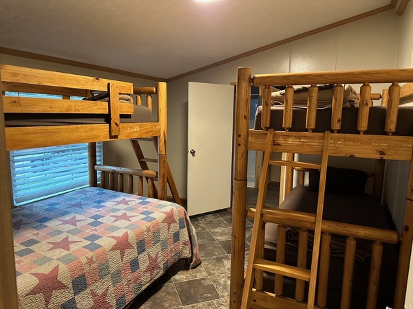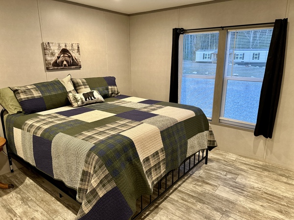 This is a five bedroom cabin that sits in the heart of the campground with beautiful views. This home has 3 full bathrooms, a huge fully functional kitchen, washer, dryer, multiple tv's with Roku streaming capabilities, a concrete patio with a fire pit and a grill, and a wrap around porch with plenty of seating. All linens are furnished. The Lodge is perfect for large groups and can sleep 20. The master has a king bed with master bathroom and twin trundle bed, the second bedroom has 1 king bed, the third bedroom has 2 sets of twin bunks, the fourth bedroom has 2 sets of twin bunks, and the fifth bedroom has 1 twin bunk set and 1 full bunk set. This house is also ADA compliant. Free Wi-Fi available.