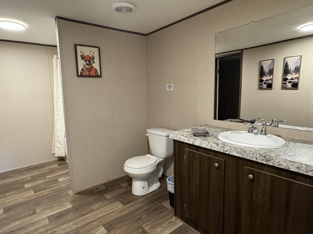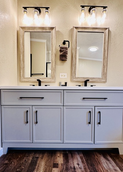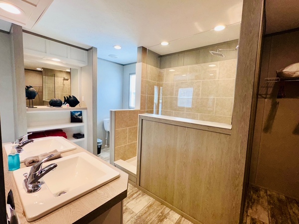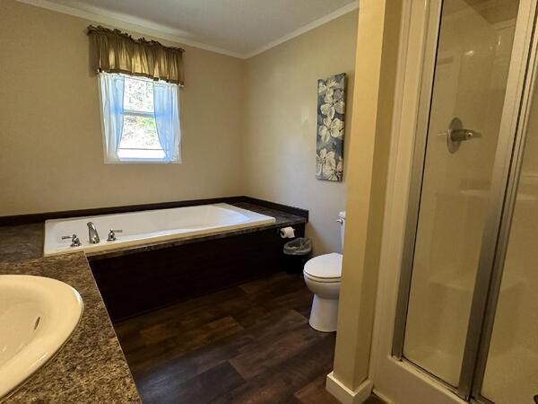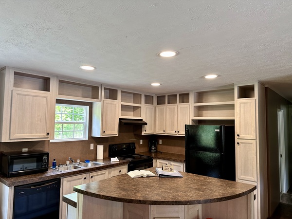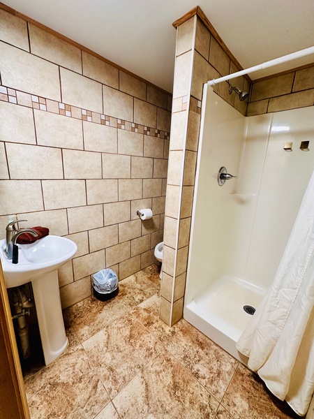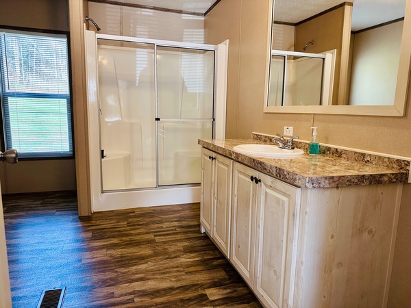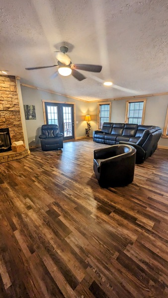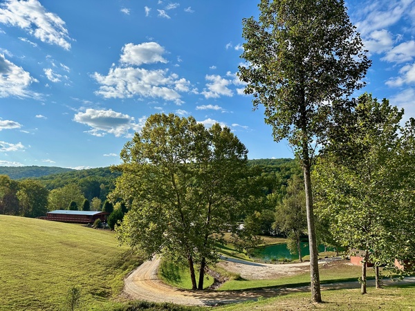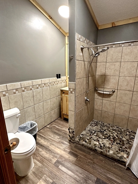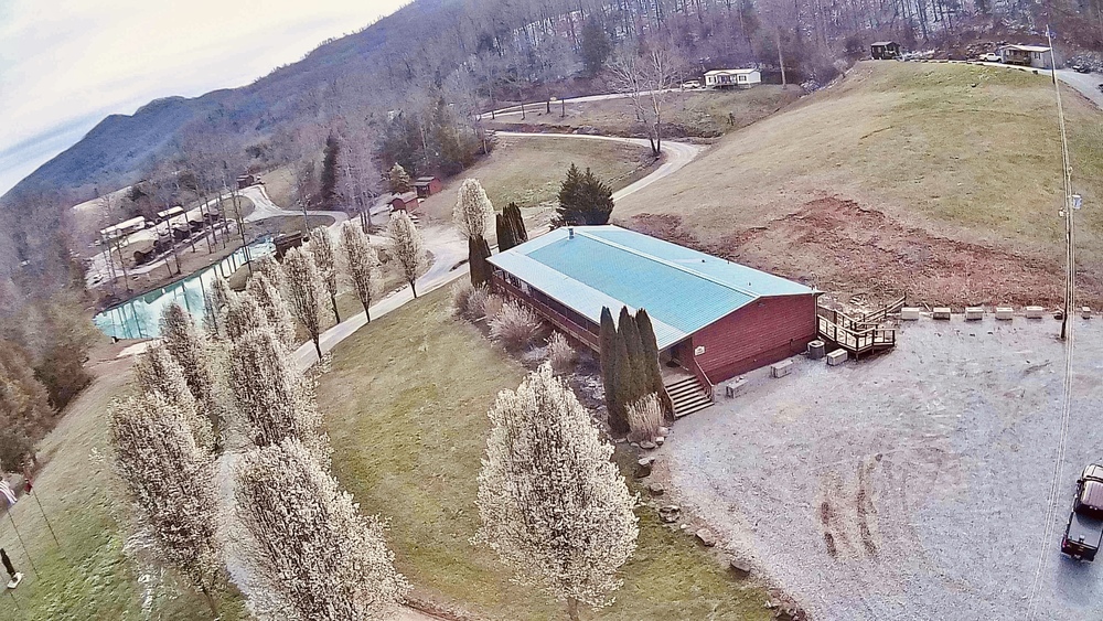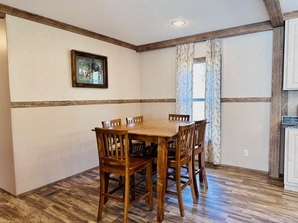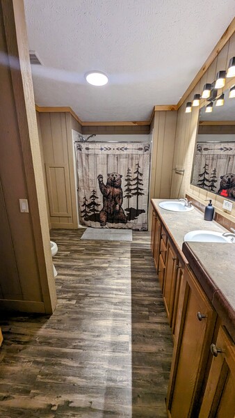 This is a five bedroom cabin that sits in the heart of the campground with beautiful views. This home has 3 full bathrooms, a huge fully functional kitchen, washer, dryer, multiple tv's with Roku streaming capabilities, a concrete patio with a fire pit and a grill, and a wrap around porch with plenty of seating. All linens are furnished. The Lodge is perfect for large groups and can sleep 20. The master has a king bed with master bathroom and twin trundle bed, the second bedroom has 1 king bed, the third bedroom has 2 sets of twin bunks, the fourth bedroom has 2 sets of twin bunks, and the fifth bedroom has 1 twin bunk set and 1 full bunk set. This house is also ADA compliant. Free Wi-Fi available.
