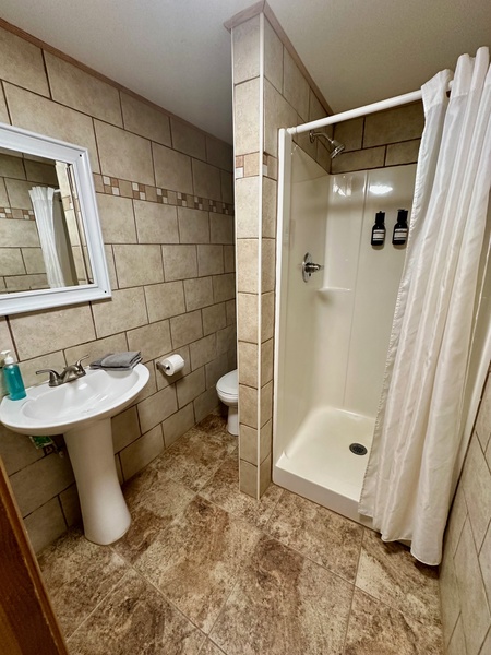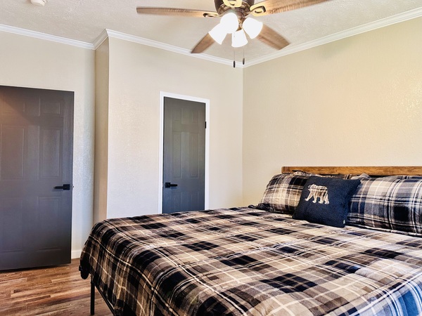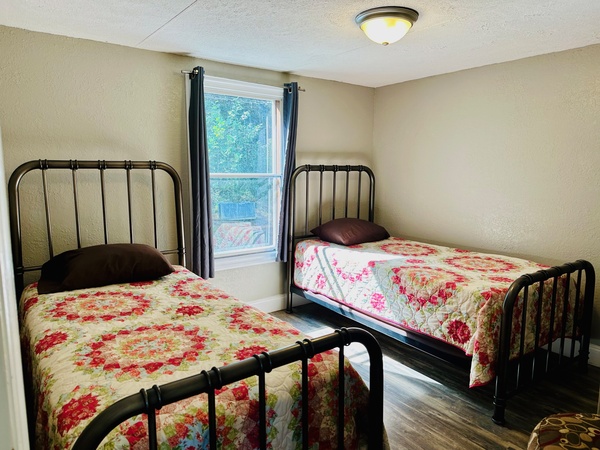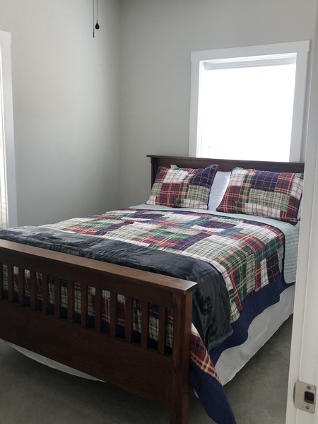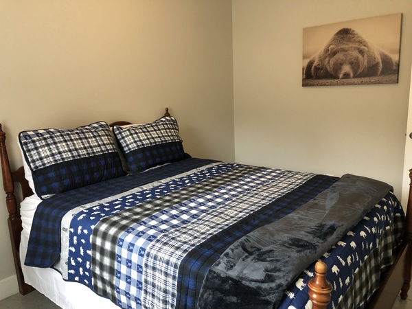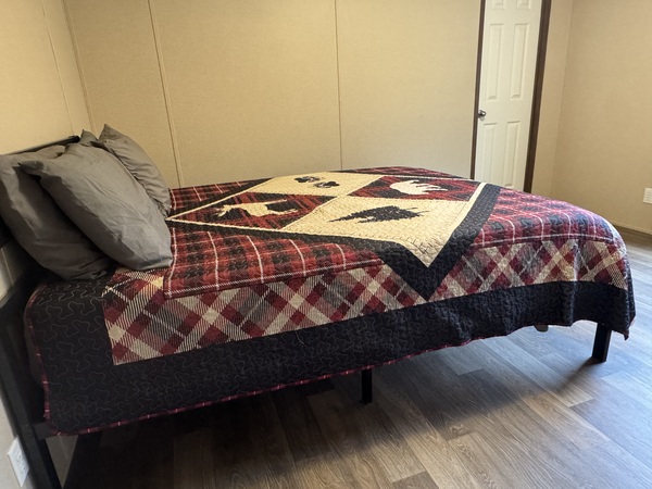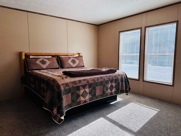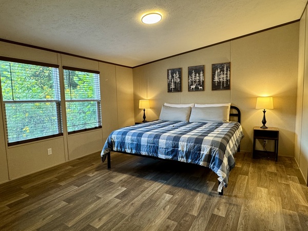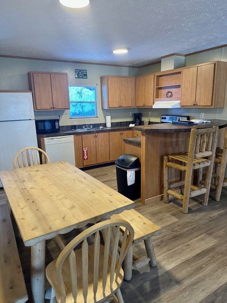 This cabin is across the street from the main campground. It sleeps 8 with 4 individual bedrooms each with a queen size bed, 2 full bathrooms, full kitchen with stove/oven and all amenities, dishwasher, washer/dryer, 55" smart TV with cable, fire ring, outdoor table/chairs and charcoal BBQ grill. All linens are provided. Does not have Wi-Fi.