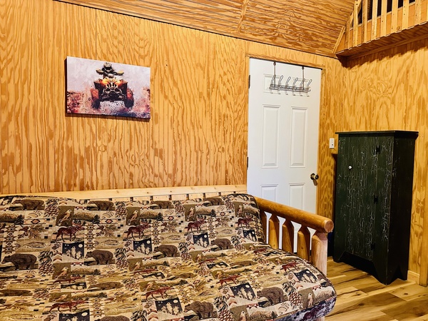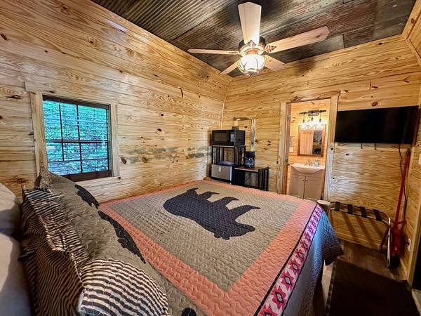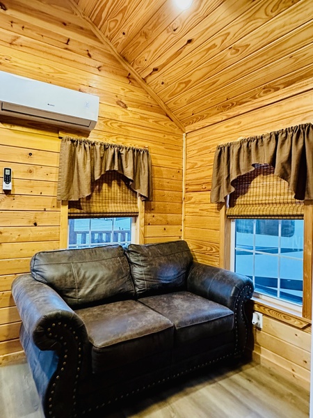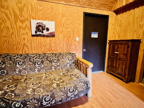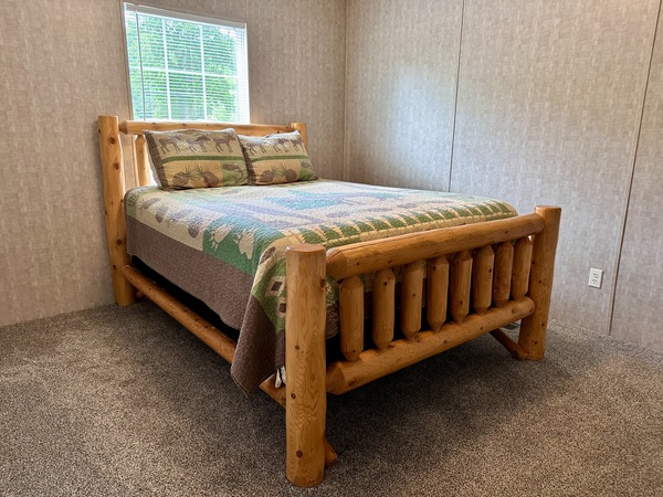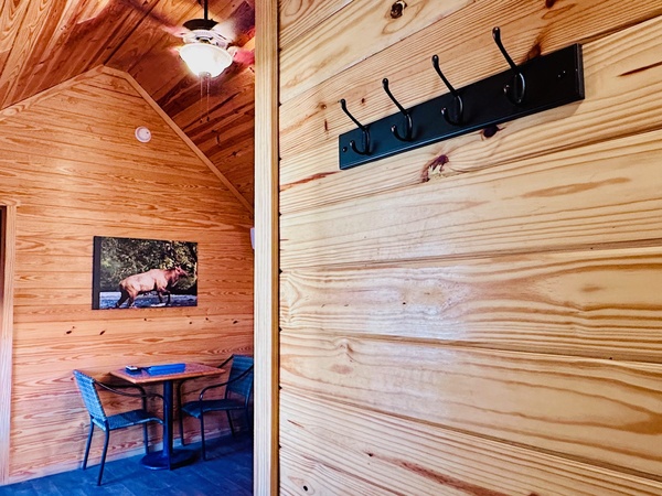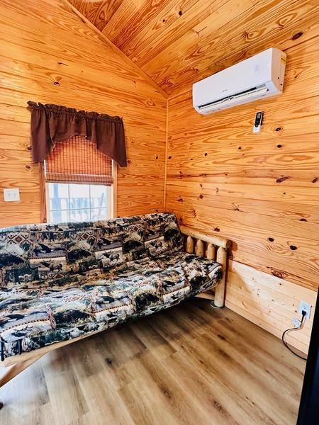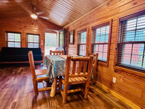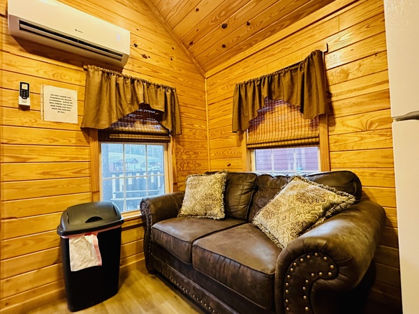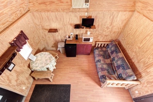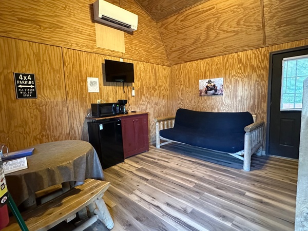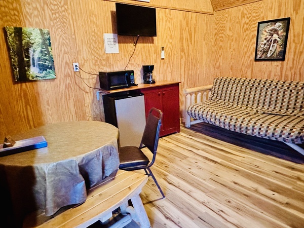 Larger one room open concept cabin with a loft and sleeps 6 people with 2 full beds and a log full size sofa futon bed. Cabins have heat/air, TV with Roku capability, microwave, mini fridge, full bathroom, and coffee makers. Free Wi-Fi available. Linens are furnished. This cabin is also pet friendly. There is a $20 plus tax nonrefundable pet fee per pet per night. Must be crated if left alone on property. Each site is limited to one vehicle and one trailer. Additional parking is available in our overflow lot by permit only at a rate of $10 per day.