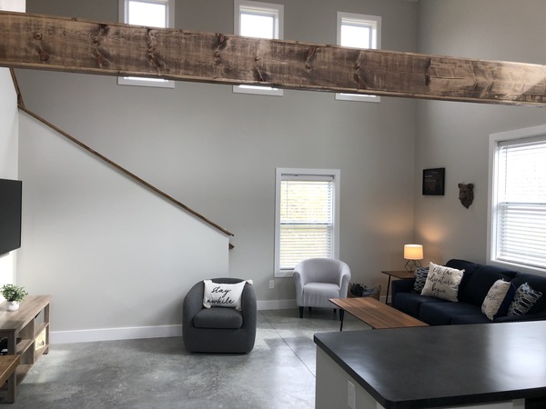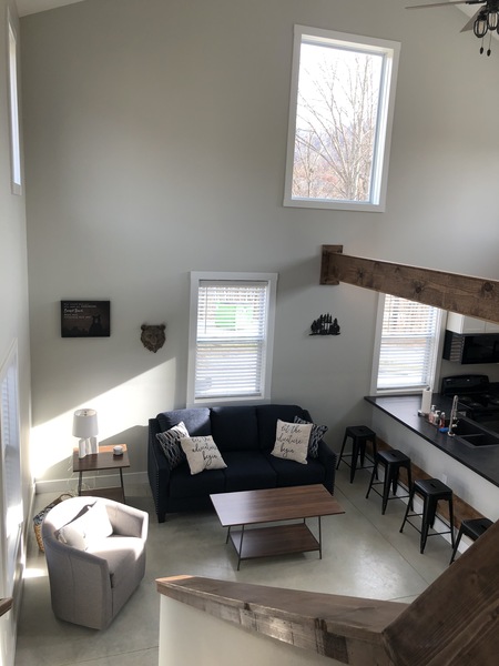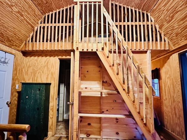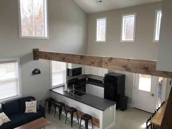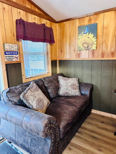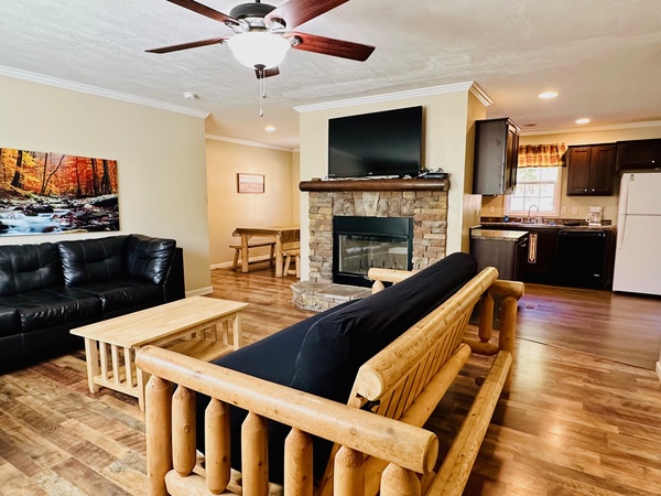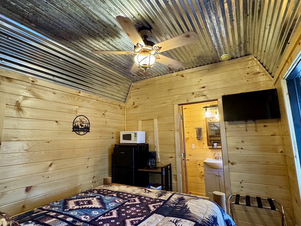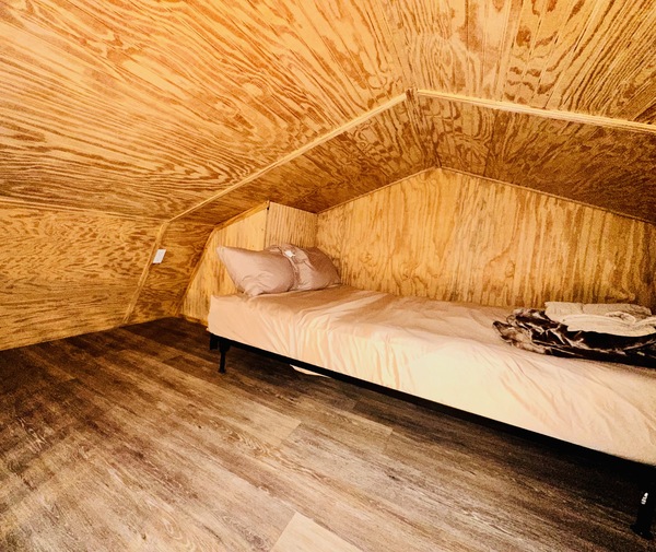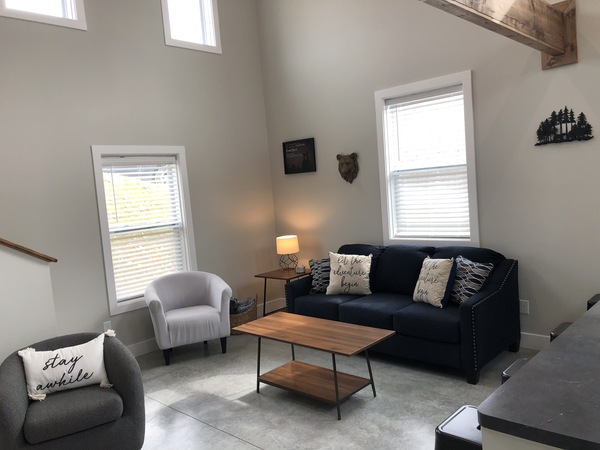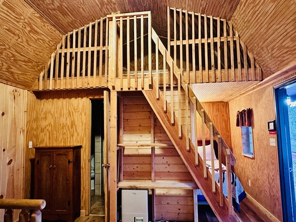Larger one room open concept cabin with a loft and sleeps 6 people with 2 full beds and a log full size sofa futon bed. Cabins have heat/air, TV with Roku capability, microwave, mini fridge, full bathroom, and coffee makers. Free Wi-Fi available. Linens are furnished. This cabin is also pet friendly. There is a $20 plus tax nonrefundable pet fee per pet per night. Must be crated if left alone on property. Each site is limited to one vehicle and one trailer. Additional parking is available in our overflow lot by permit only at a rate of $10 per day.