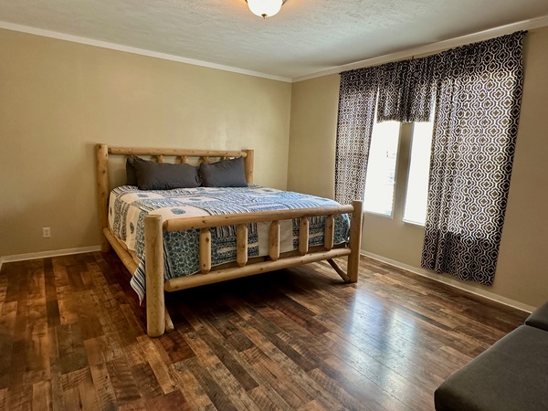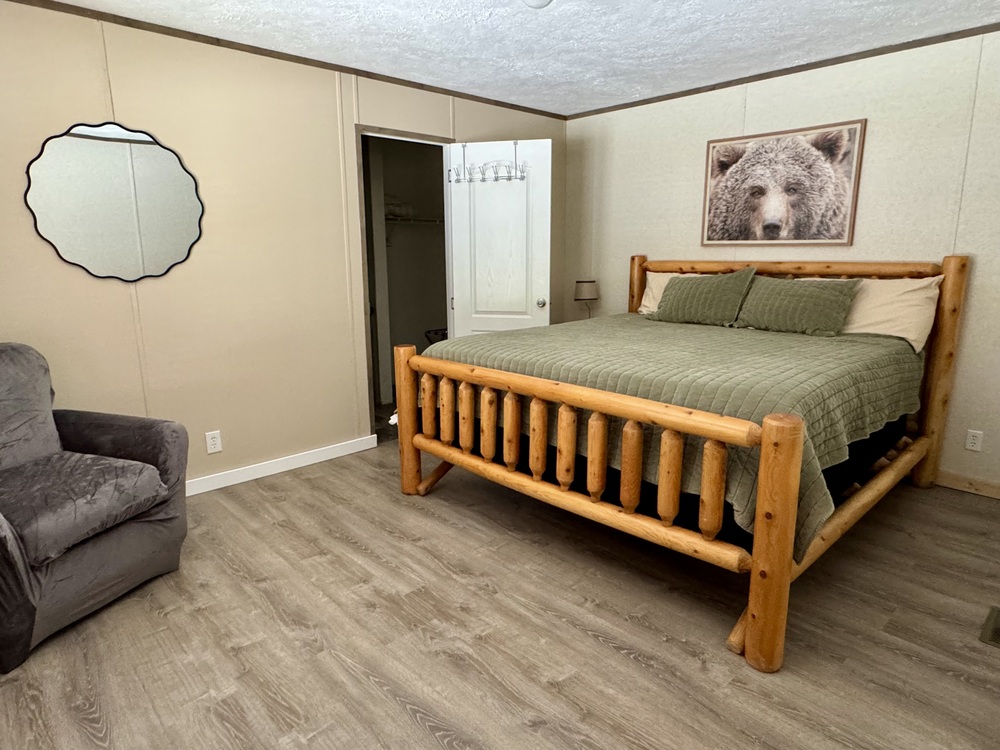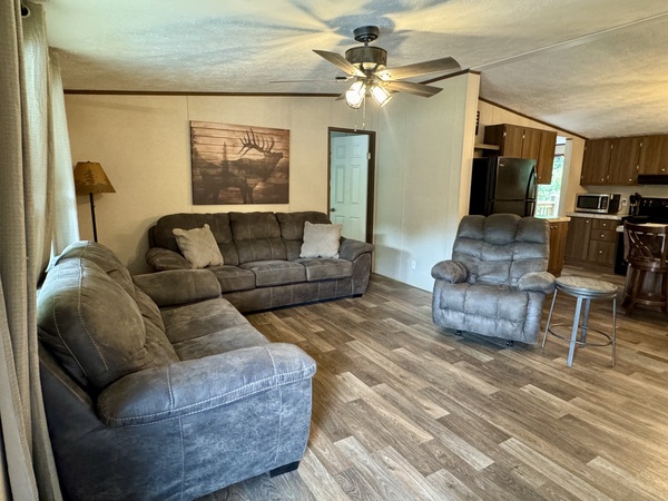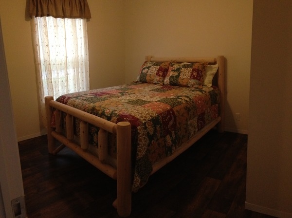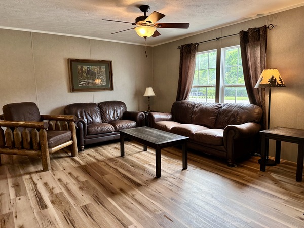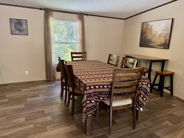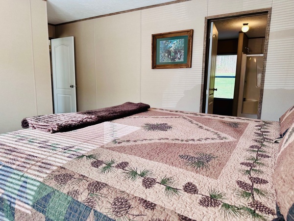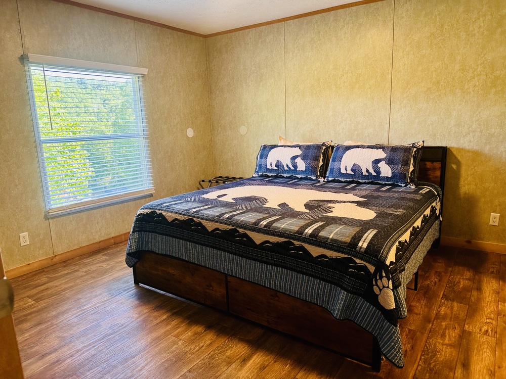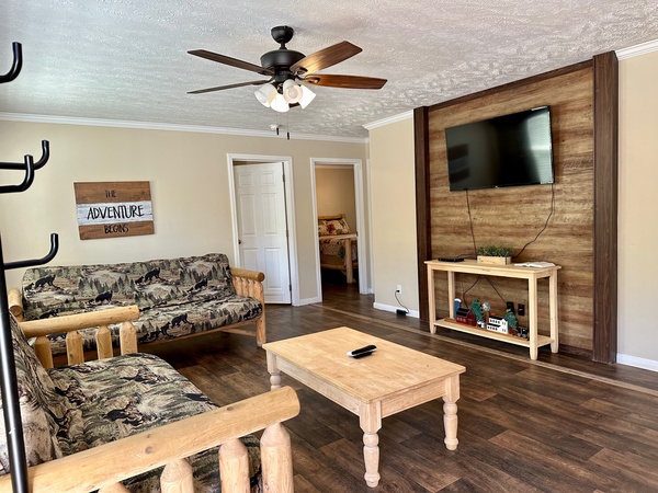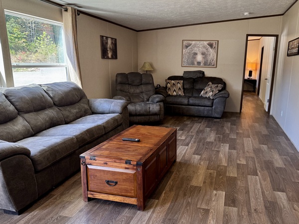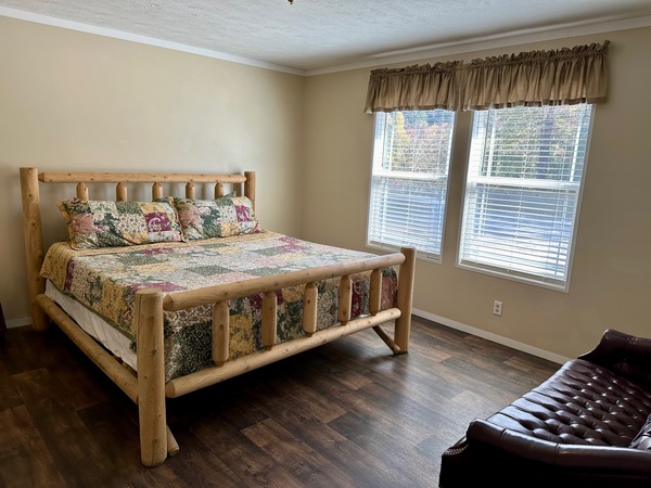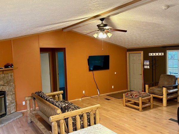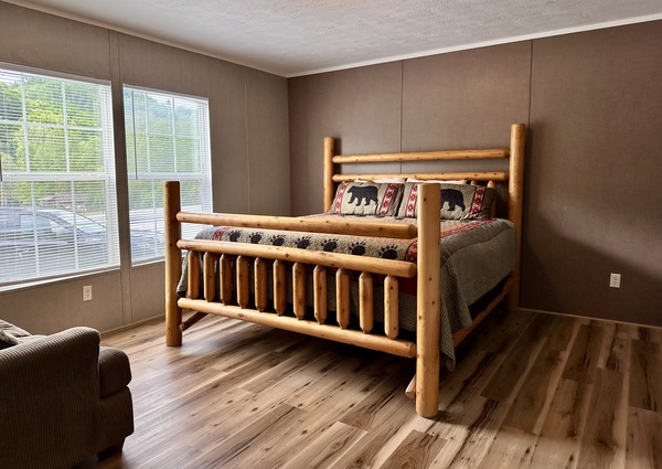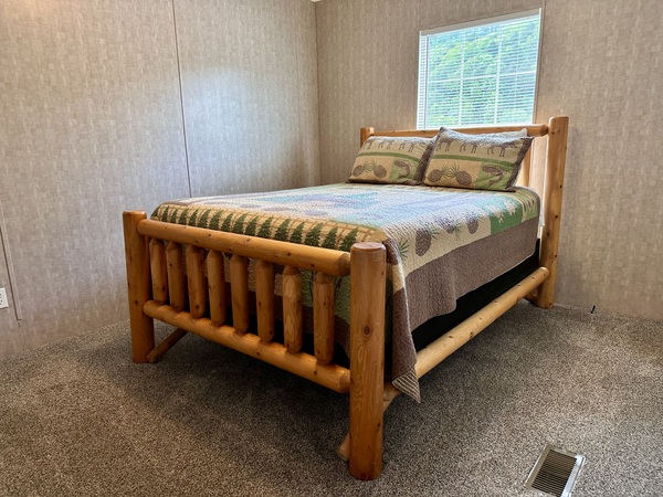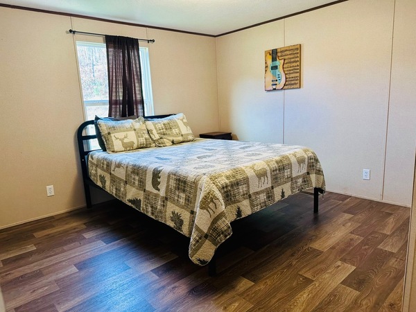 This is a gorgeous (3) bedroom home with 2 full bathrooms, huge kitchen with all amenities, washer/dryer, living room with 55 inch TV with Roku capability, deck, picnic table, fire ring and charcoal grill. The home sleeps 9, with (1) log king bed in master bedroom, 2 additional bedrooms each with a log queen bed, a queen size sleeper sofa in the living room, and a roll-away bed. Plenty of parking for trucks and trailers. All linens are furnished. Free Wi-Fi available.