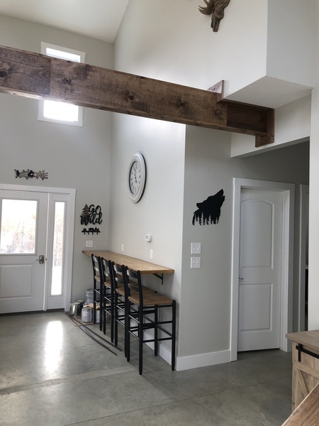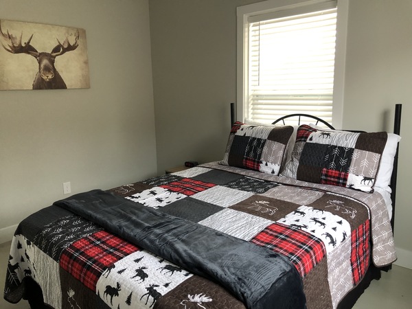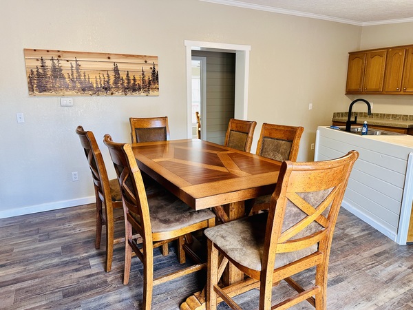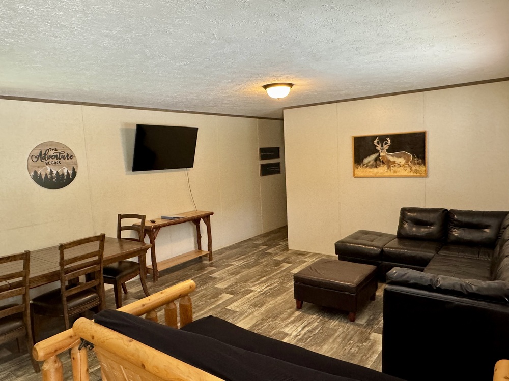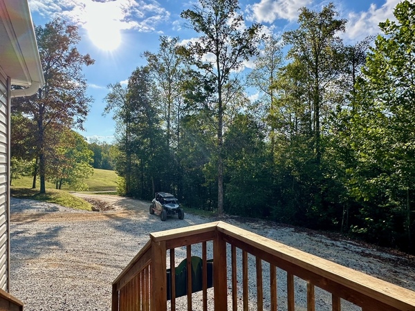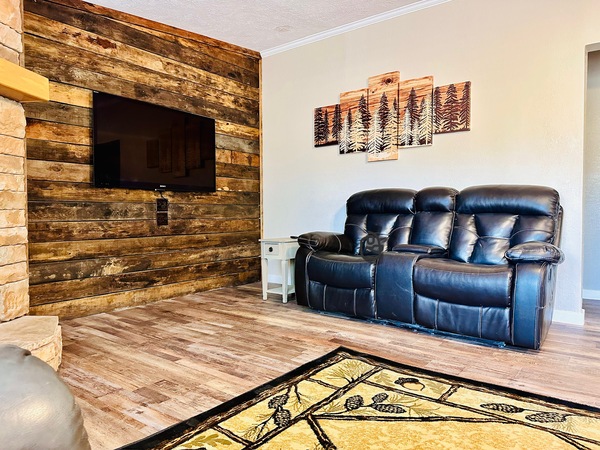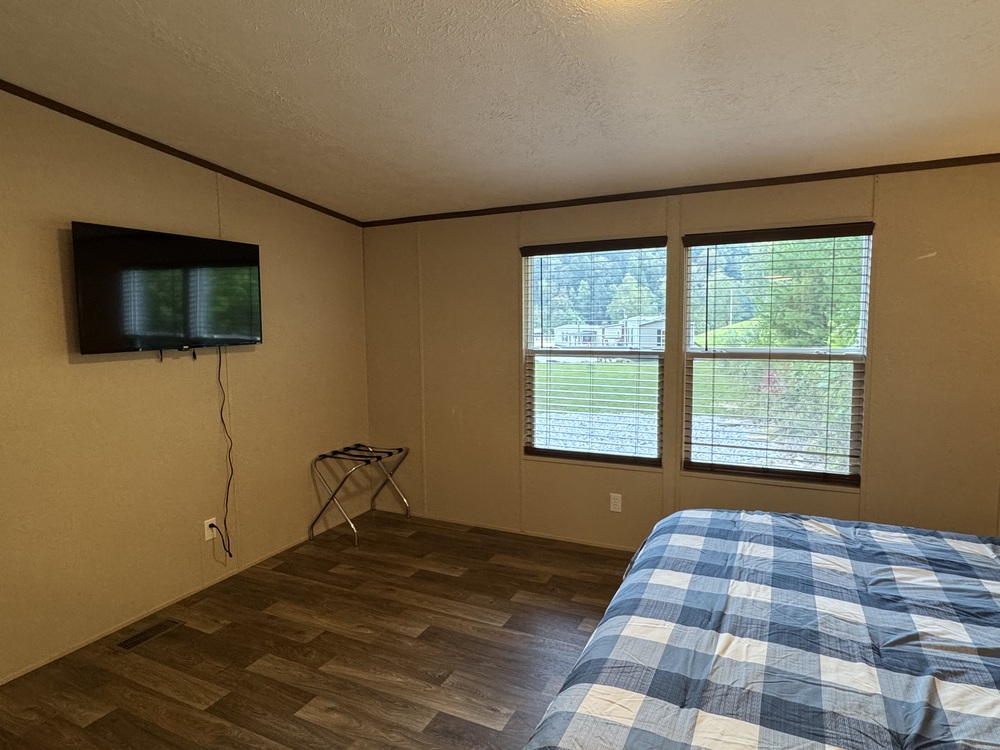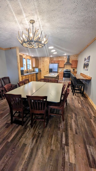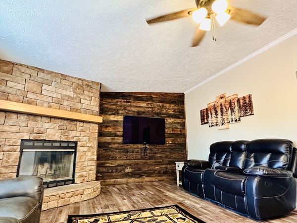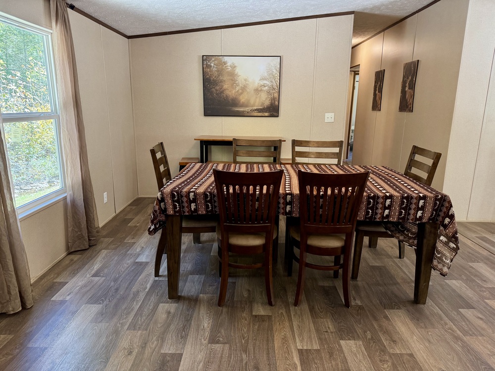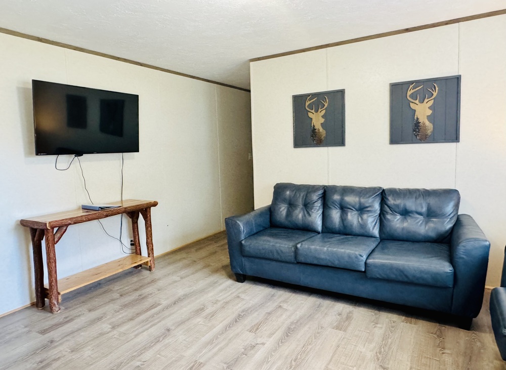 This is a gorgeous (3) bedroom home with 2 full bathrooms, huge kitchen with all amenities, washer/dryer, living room with 55 inch TV with Roku capability, deck, picnic table, fire ring and charcoal grill. The home sleeps 9, with (1) log king bed in master bedroom, 2 additional bedrooms each with a log queen bed, a queen size sleeper sofa in the living room, and a roll-away bed. Plenty of parking for trucks and trailers. All linens are furnished. Free Wi-Fi available.