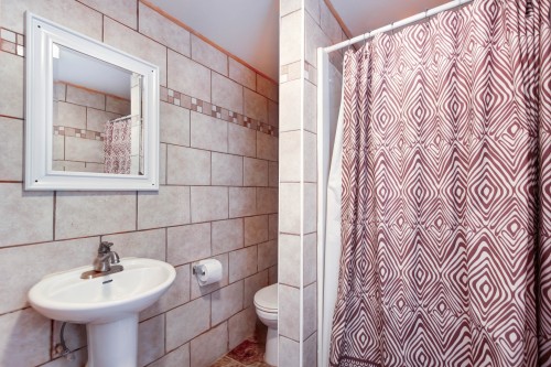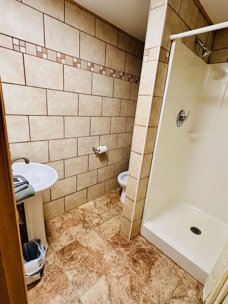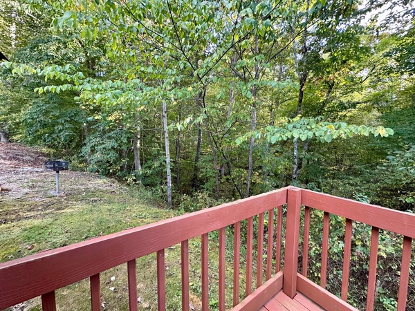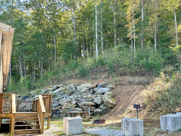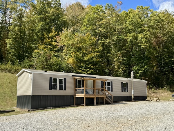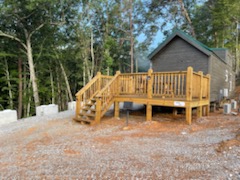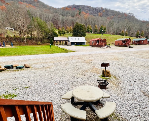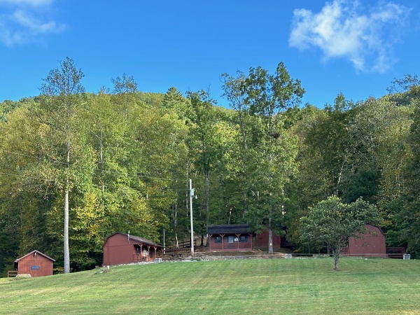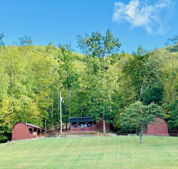 This cabin is located on the upper ridge of the campground with a beautiful view from the front sitting porch and privacy from the large rear deck. It is a 1200 square foot unit with 3 bedrooms, 2 bathrooms, large fully renovated, eat-in kitchen with all new stainless stove/oven and double door refrigerator. Sleeps 8 people with 1 King, 1 queen bed, 2 twin beds and 1 full size log futon sofa/bed. Large flat screen TV with Roku capability in living room. All linens and cookware are provided. Free Wi-Fi available.