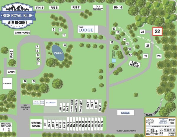 This cabin sleeps 6 and has a rear private bedroom with a queen bed and 4 midway twin beds. It has heat/air, full bathroom, and full kitchen with stove/oven, microwave, coffee maker, all cookware/utensils and Roku enabled smart TV. Linens are furnished. Free Wi-Fi available. Each site is limited to one vehicle and one trailer. Additional parking is available in our overflow lot by permit only.