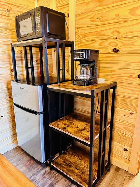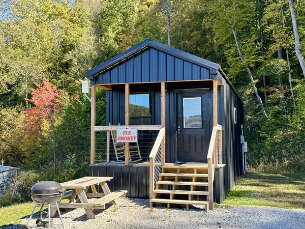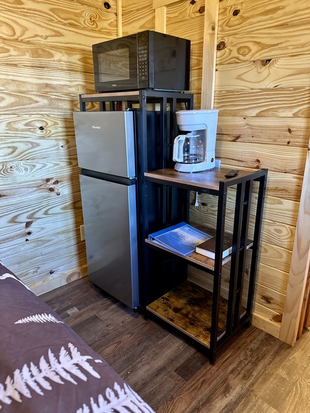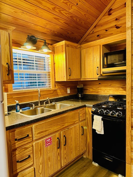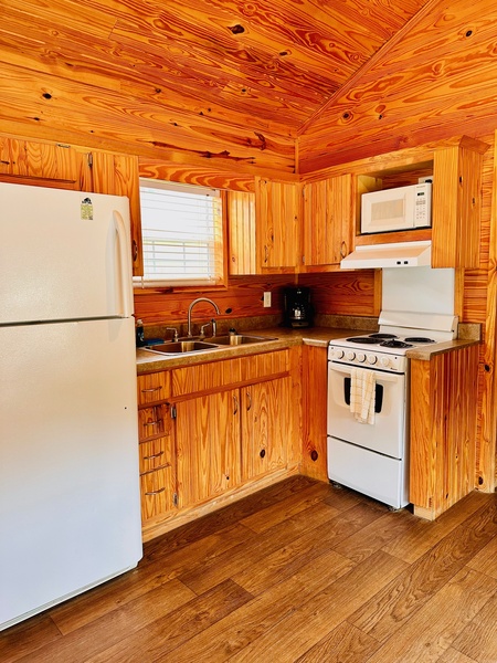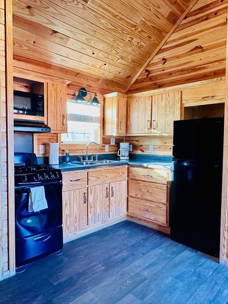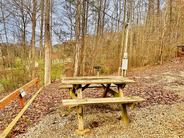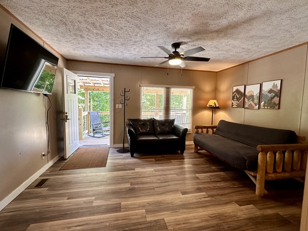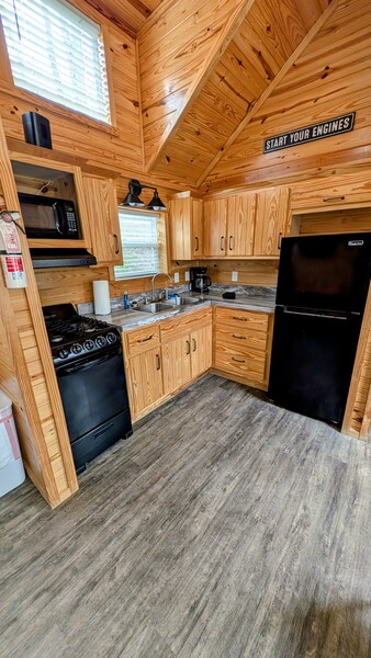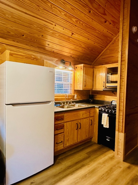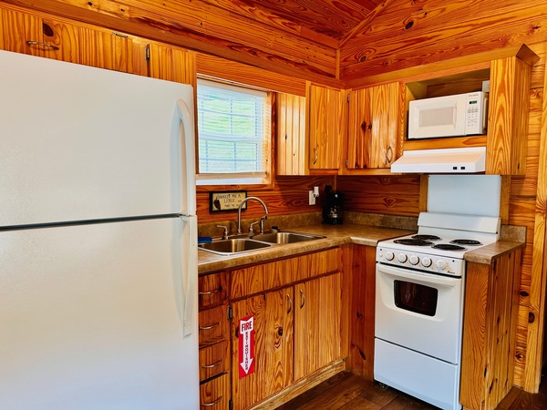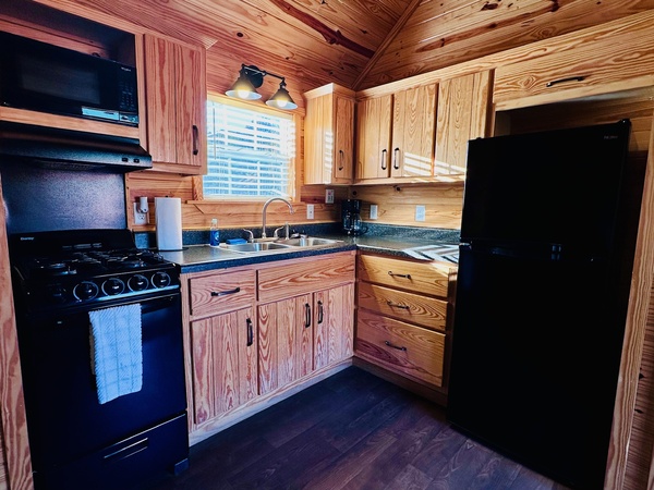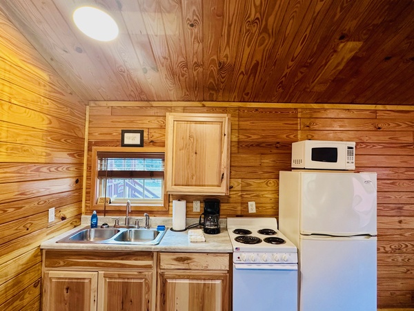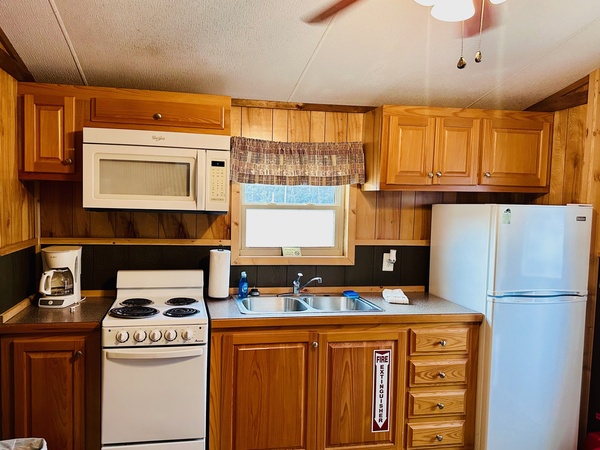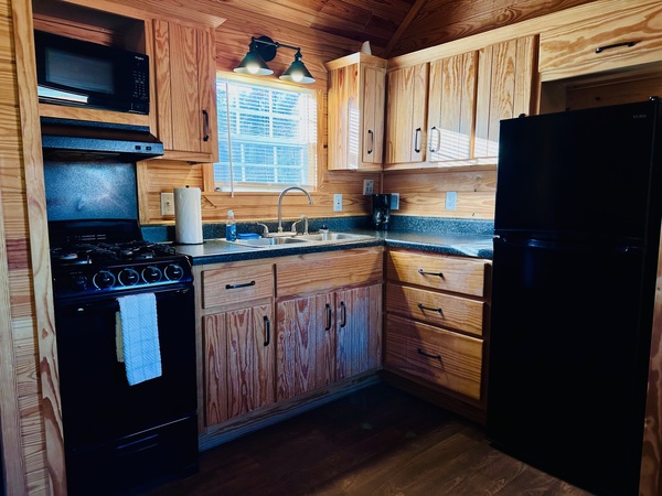 This cabin has full kitchen with stove/oven, refrigerator, microwave, coffee pot, TV with Roku capability, rear King bedroom and full size living room sofa bed. All linens, pots/pans and utensils provided. Picnic table, fire ring and charcoal grill included. Free Wi-Fi available. Additional parking is available in our overflow lot by permit only.