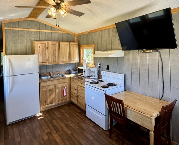 This cabin is across the street from the main campground. It features two bedrooms with queen size beds, full bathroom, fully equipped kitchen with stove/oven, microwave, full size refrigerator, dining table for 4, heat/air, ceiling fans in each room, high cathedral ceilings, and a large flat screen Smart TV, also another smart TV in 1 of the bedrooms with ROKU capability, BBQ grill, picnic table and fire ring. All linens are furnished. Parking for two vehicles. Does not have Wi-Fi.