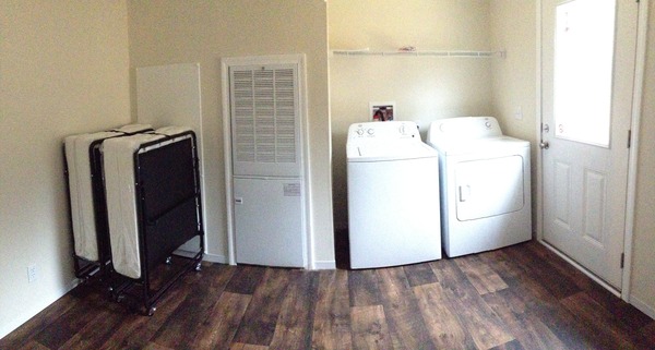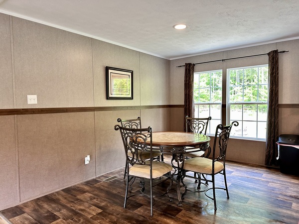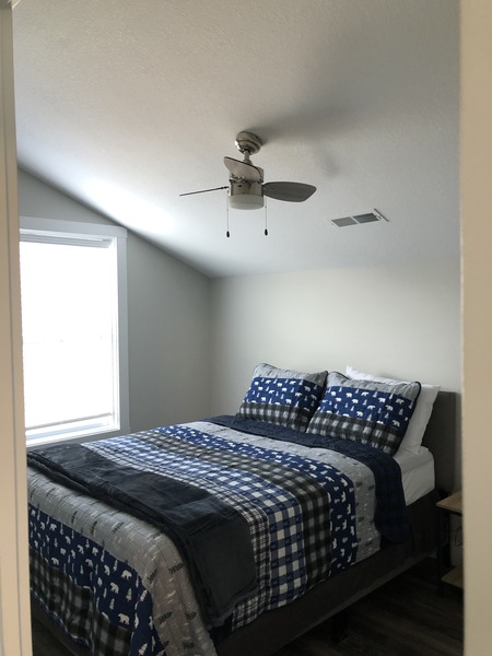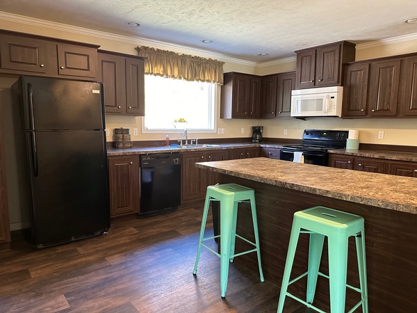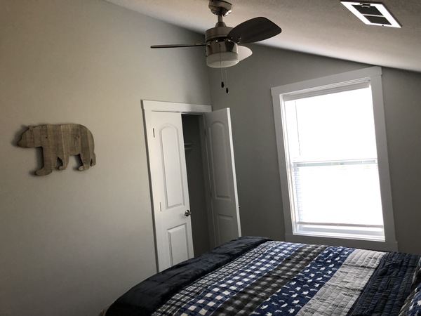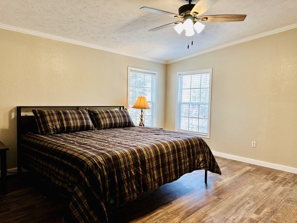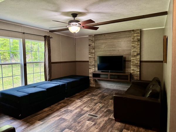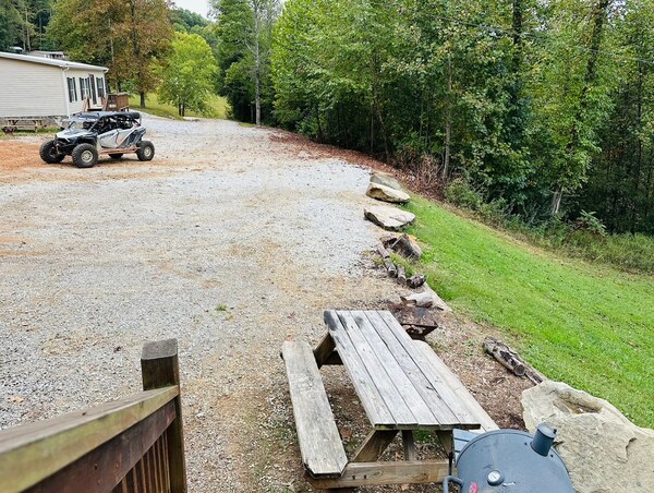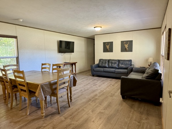 This is a spacious four bedroom home with 2 full bathrooms, huge kitchen with all amenities, washer/dryer, living room plus den, two large screen TV's with Roku capability, rear deck, picnic table, fire ring and charcoal grill. The home sleeps 12, with (1) king bed in master bedroom, 3 additional bedrooms each with a log queen bed and 2 queen size sleeper sofas in den. Plenty of parking for trucks and trailers. All linens are furnished. Free Wi-Fi available.