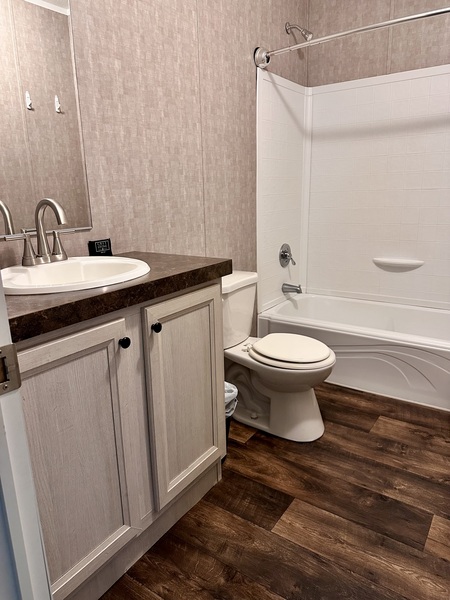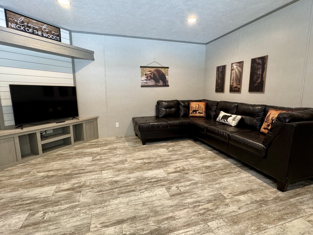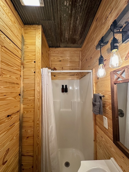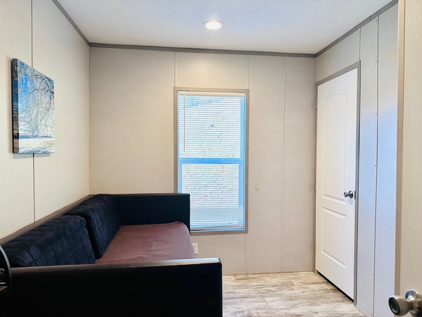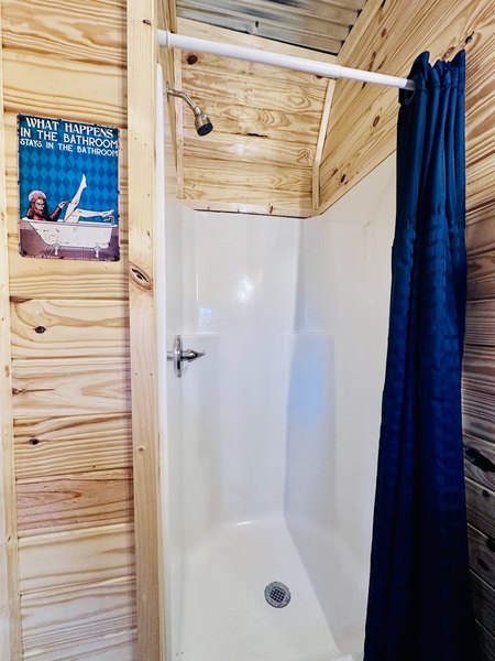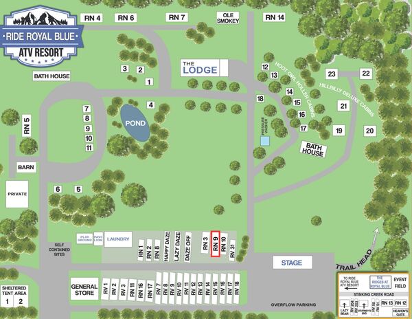 Redneck 8 sleeps 4 with a Queen size bed in the rear bedroom and two single bunk beds. It also has a full kitchen and dining area, a full bathroom, Roku enabled smart TV and a comfortable front porch. Free Wi-Fi available. Each site is limited to one vehicle and one trailer. Additional parking is available in our overflow lot by permit only.