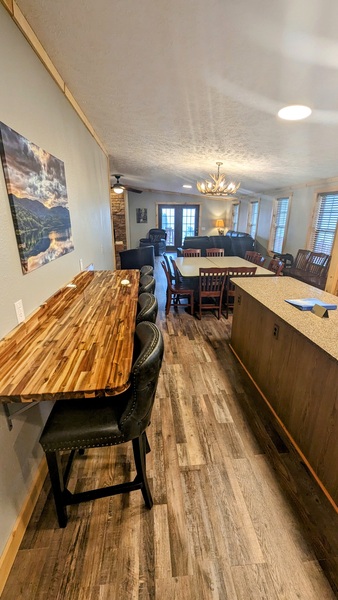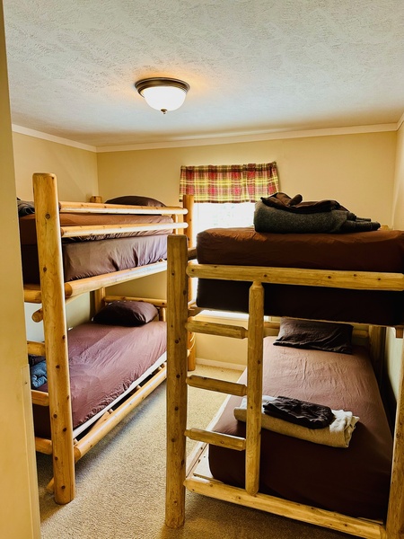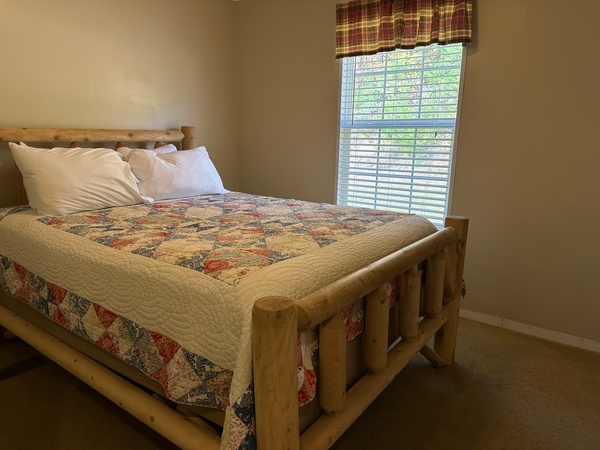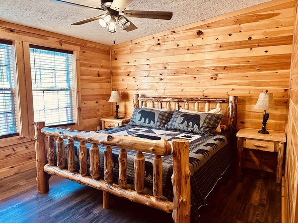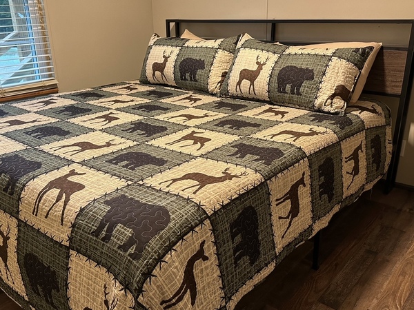 This spacious 1750 square foot cabin is very roomy, it sleeps 12 with 4 bedrooms and 2 full bathrooms. Fully equipped kitchen with stove/oven, dishwasher, washer/dryer, Large TV with Roku capability, and 1 king bed in master, 2 sets of twin bunk beds second bedroom, 1 queen bed in both the third and fourth bedrooms, 1 full log sofa/bed. Linens are included along with a charcoal grill and picnic table. Free Wi-Fi available. This cabin has a newly added covered porch.