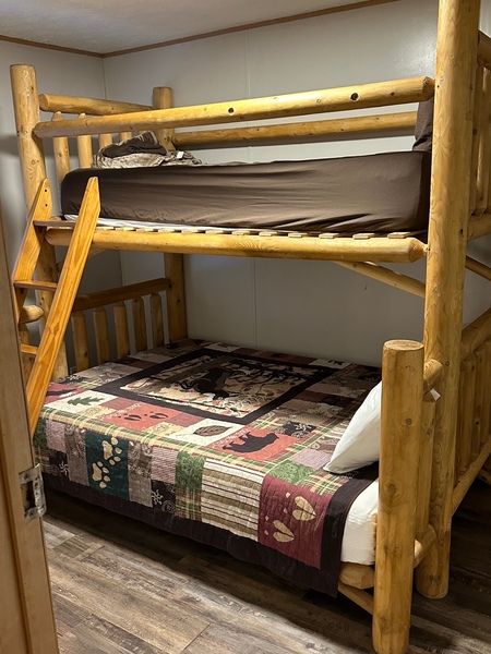 This homes has 3 bedrooms and 2 bathrooms, a full modern kitchen with all utensils, washer/dryer, 55 inch TV with Roku capability, sleeps (8) with (1) king size log bed, (4) twin size bunk log beds, and (1) full size log bed. All linens are furnished. It is has a charcoal grill, picnic table and fire ring. This cabin also has a newly built covered front porch. This cabin is also pet friendly. There is a $20 plus tax nonrefundable pet fee per pet per night. Must be crated if left alone on the property. Free Wi-Fi available.