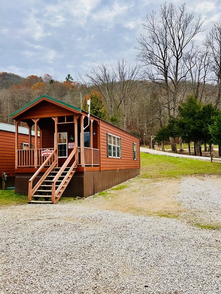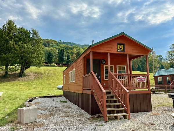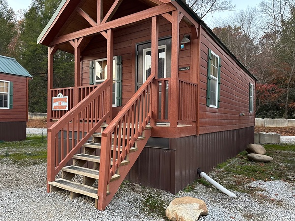 This cabin is across the street from the main campground. It sleeps 6, has a rear private bedroom with a queen size bed and 4 mid-section twin beds. It has heat/air, full bathroom, full kitchen with stove/oven, microwave, coffee maker, and all cookware/utensils. Large flat screen Smart TV with ROKU capability. All linens are furnished. Parking for two vehicles. Does not have Wi-Fi.