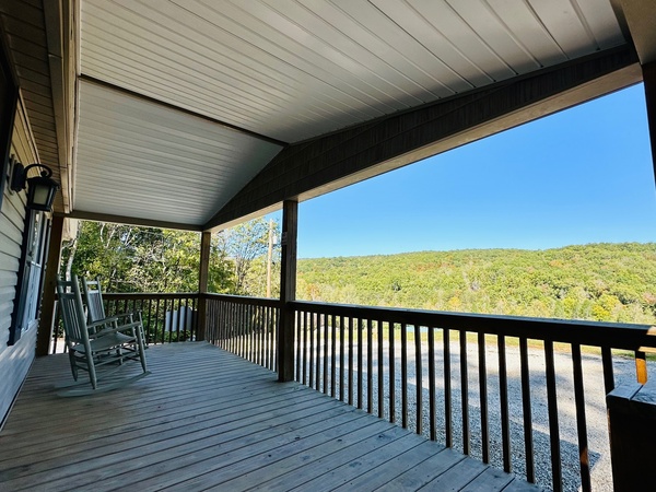 This is a five bedroom home that sits beside a beautiful rambling creek, off the road and very private. There is another home, Ridge 4, close by and the two can accommodate large groups. This home has 3 full size bathrooms, a huge fully functional kitchen with all amenities, washer, dryer, microwave, full size refrigerator, large screen TV that has ROKU streaming capability, rear concrete patio, picnic table, fire ring, and charcoal grill. and all linens. The home sleeps 11 comfortably with 2 king beds, 3 queen beds, and 1 twin bed. The bedrooms are very spacious and there is ample room for additional guests but the air mattresses and linens are the guests responsibility. Maximum limit of 14 allowed. Free Wi-Fi available. Newly added covered front porch.