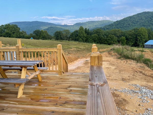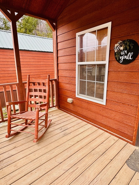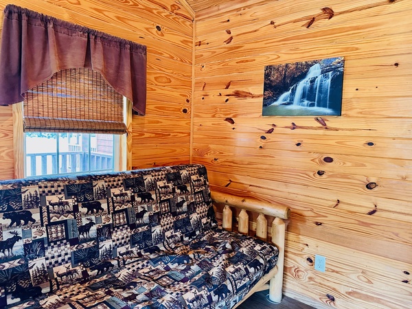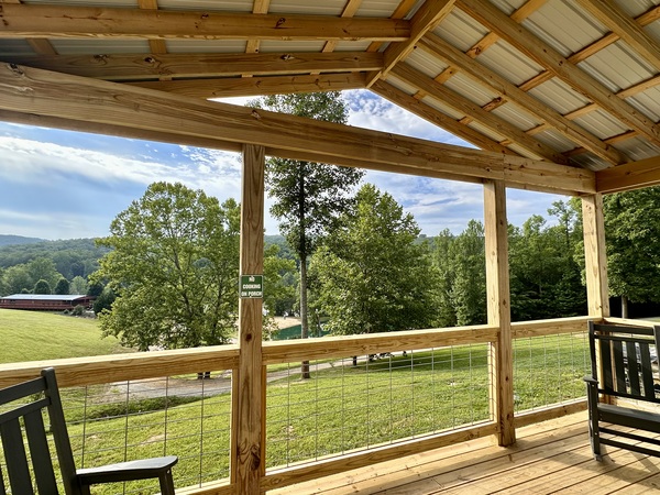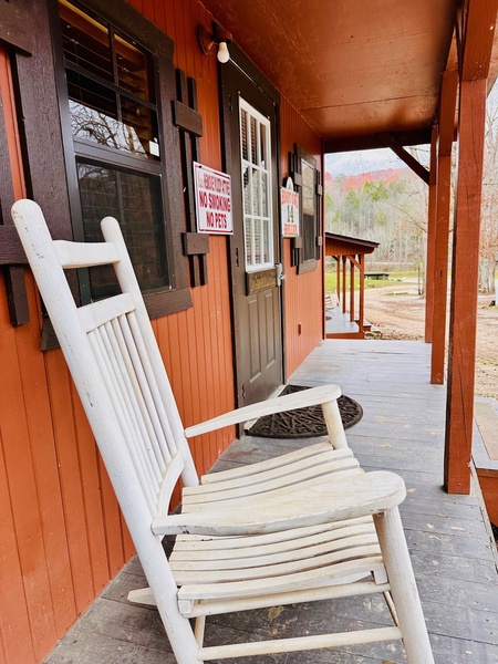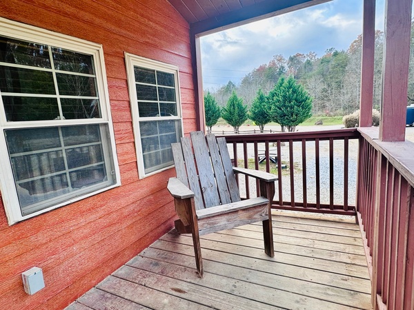 Redneck 7 has an amazing view overlooking the campground with covered porch. Sleeps up to 10 people with 1 King bed, 2 full beds, 2 twin beds and 1 full size log futon sofa/bed. It has 3 bedrooms and 2 full bathrooms, a full eat-in kitchen, all cookware and utensils, dishwasher, TV with Roku capability, washer and dryer and linens are included. Free Wi-Fi available. This cabin is also pet friendly. There is a $20 plus tax nonrefundable pet fee per pet per night. Must be crated if left alone on the property.
