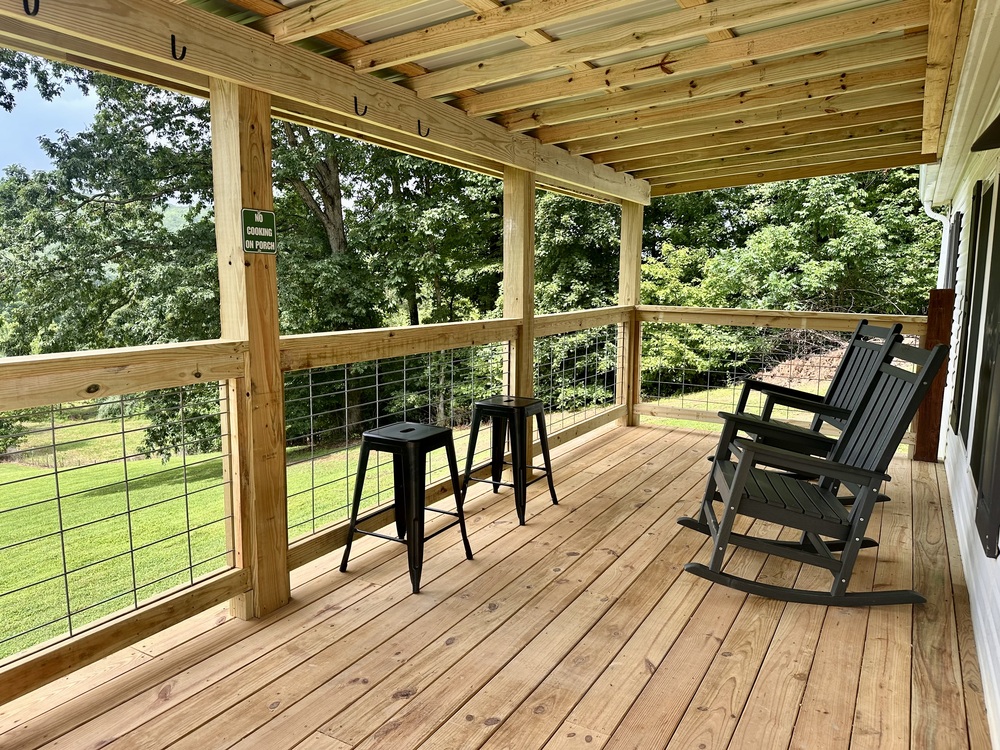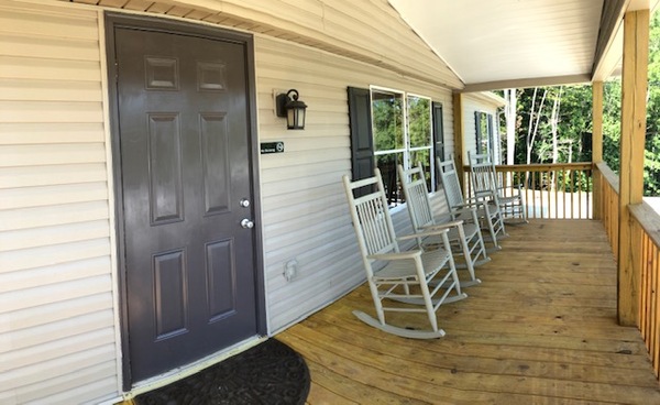 Cabin has 3 bedrooms and 2 bathrooms. Sleeps 11 people with 1 King, 1 full, 5 twin beds and 1 full size Hideaway sofa/bed. Cabin has an eat-in and fully equipped kitchen with stove/oven, all cookware and utensils, TV with Roku capability, and washer/dryer. Linens are provided. Free Wi-Fi available. Newly added covered front porch.